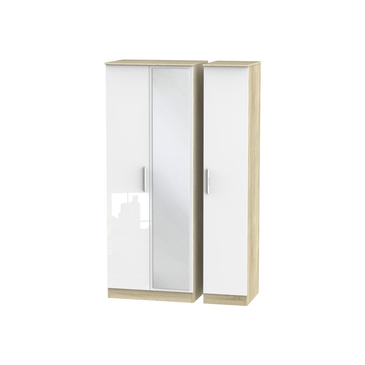 A beautiful addition to your bedroom, this Carlton Three Door Mirrored Wardrobe provides you with all of the space you need for your clothes. Designed with two solid doors and one mirrored, this wardrobe is an excellent way to bring light into your room. With a hanging rail fitted inside, this is the perfect place for dresses and other long clothing items.