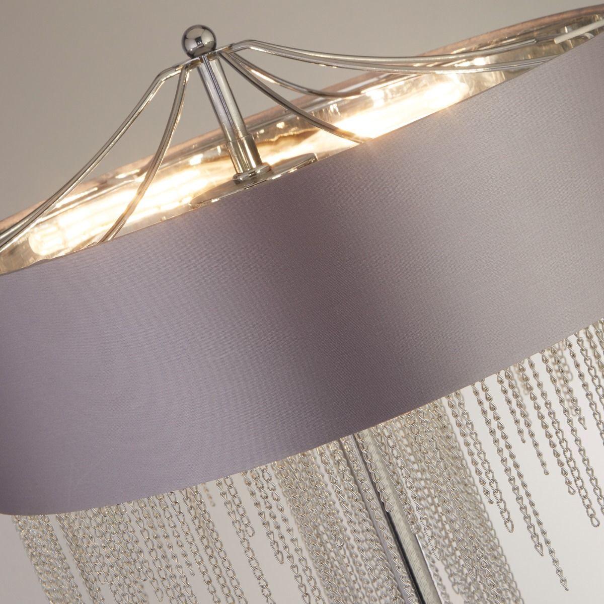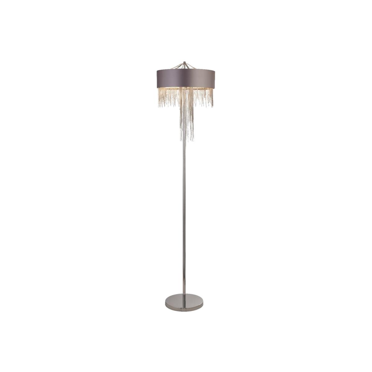 Modern floor lamp boasting grey shade and chain detailing. Add a contemporary touch to your home with the Carmella range, exclusive to Pagazzi Lighting. Featuring a modern grey circular shade and delicate chrome chains. Perfect for complementing modern interiors, the Carmella floor lamp is complete in a modern polished chrome finish. Perfect to place behind sofas or other dark corners of the home.
