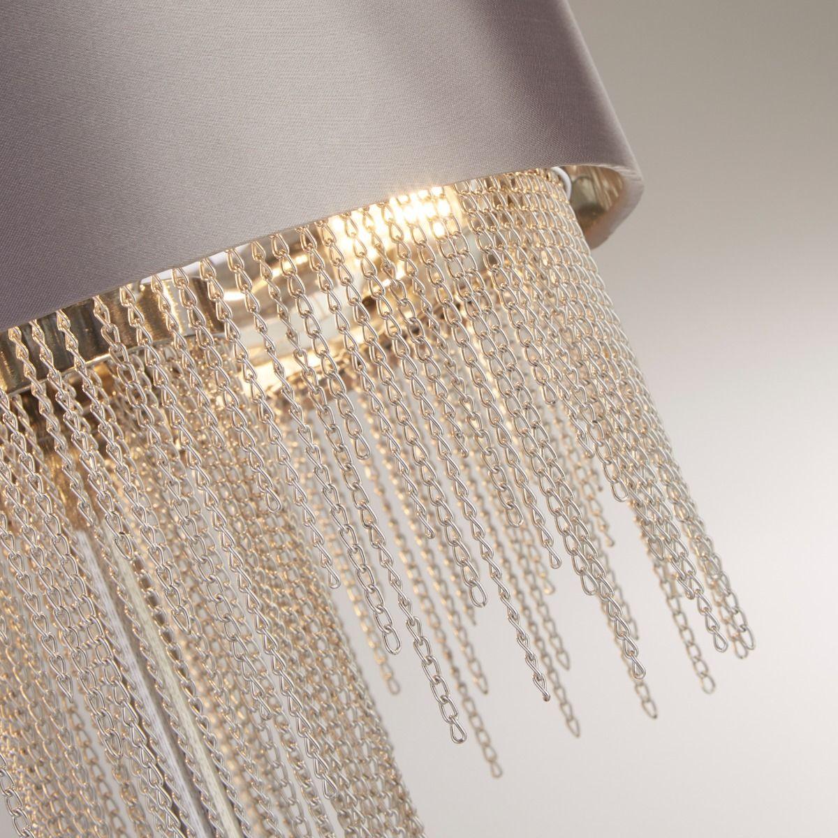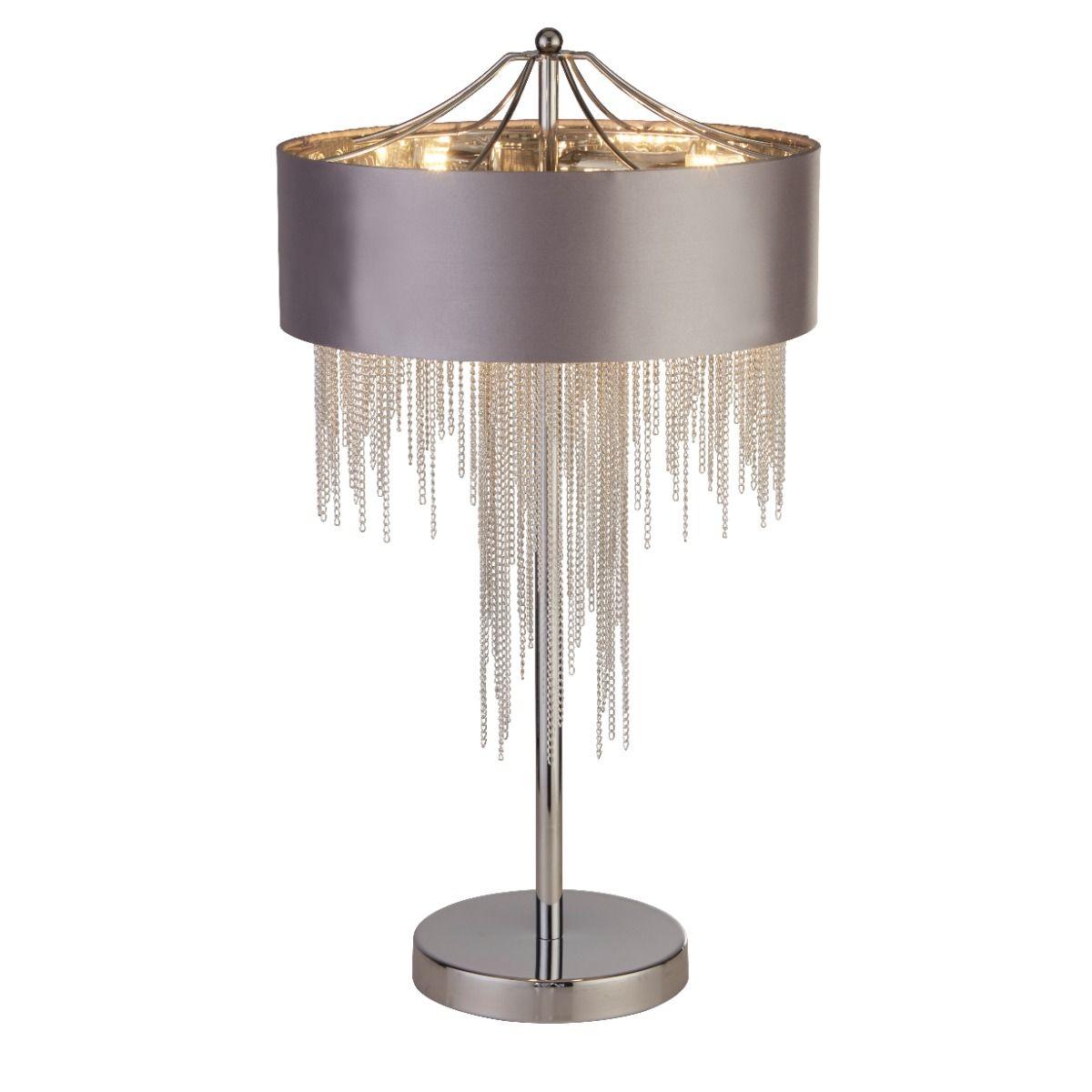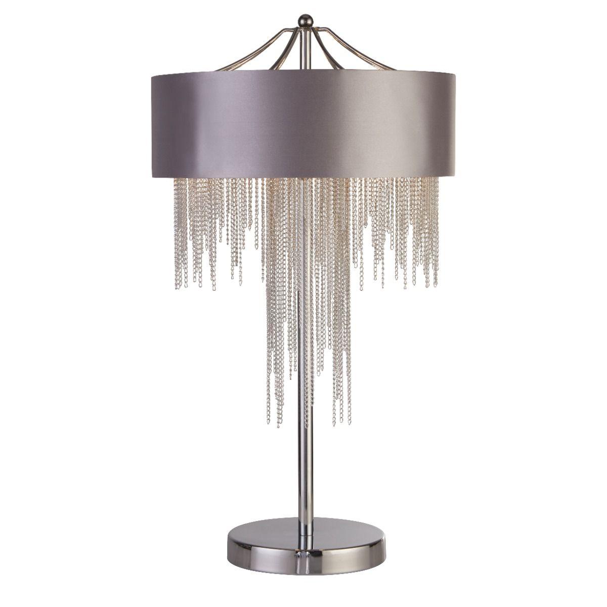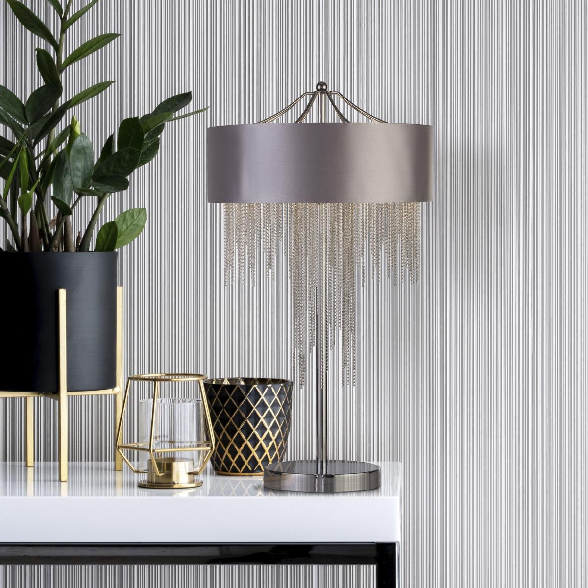 Modern table lamp boasting grey shade and chain detailing. Add a contemporary touch to your home with the Carmella range, exclusive to Pagazzi Lighting. Featuring a modern grey circular shade and delicate chrome chains. Perfect for complementing modern interiors, the Carmella table lamp is complete in a modern polished chrome finish. The table lamp is perfect for use on bedside tables, console and side tables..