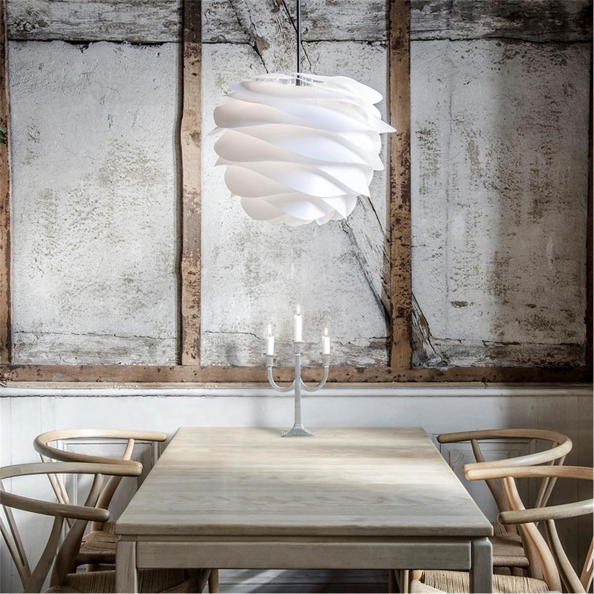 The Carmina lamp shade in white offers a sleek, contemporary look that pairs beautifully with modern or minimalist interiors. I love its sculptural form, which adds visual interest without overwhelming the space. It works particularly well in dining rooms, as shown in the image, bringing a soft, diffused glow that warms up the overall setting. For styling, consider hanging it over a light wooden table and coordinating with neutral or textured accessories, such as linen or woven pieces, to keep the aesthetic cohesive. Its neutral hue and elegant shape make it versatile enough to complement both understated and more layered interiors, enhancing the overall ambiance with subtle sophistication.