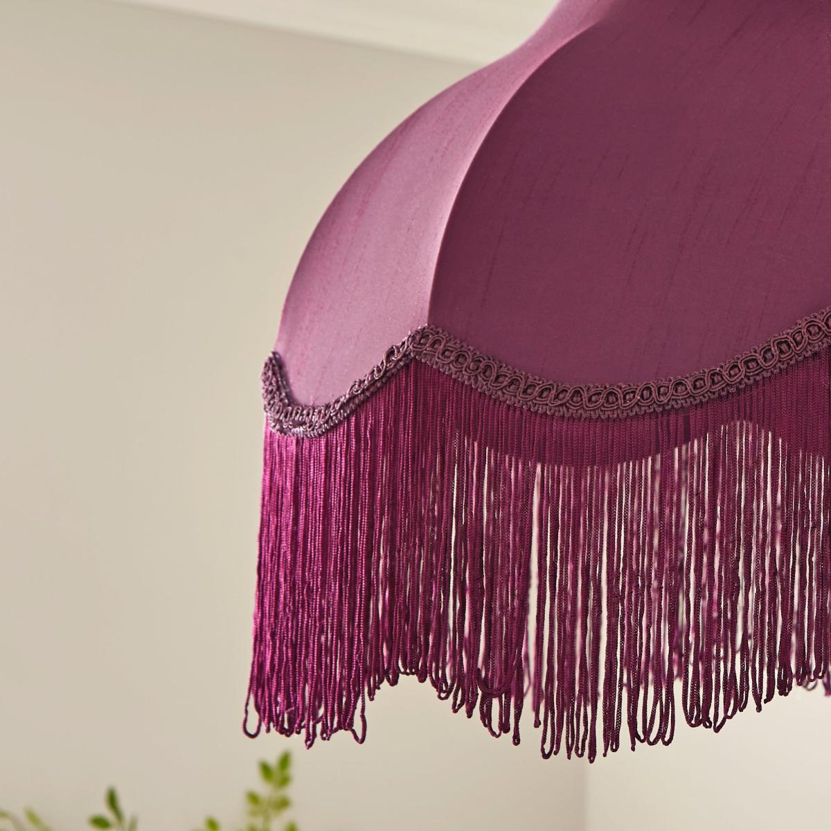 * Gorgeous, Classic Shape* Vintage-Inspired Design* Eye-Catching Fringe Detailing* Made from Polyester - Satin Effect* Requires: Standard (GLS) Bulb With its stunning vintage-inspired design, the Carmona Fringed Satin Lamp Shade boasts a matching colour braid, unique fringe detailing, and a soft balloon liner. Available in a myriad of colour choices, this shade makes an impact in any living space.