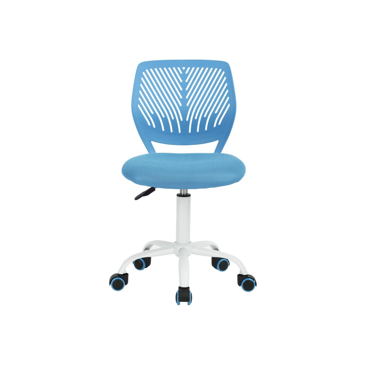 Ideal for a child's or teenager's desk, our Carnation chair will bring colour to their workspace! Its padded seat and slightly inclined backrest, both flexible and resistant, will offer you optimal comfort. Very practical, the height of this chair is adjustable and will easily adapt to the height of your children as well as to different desk heights. Finally, the five casters will allow you to glide easily and quickly from one end of the room to the other. This cheerful blue office chair brings together ergonomic support and fresh design with a leaf-pattern cut-out backrest that promotes airflow and adds a modern touch The padded seat is wrapped in breathable mesh fabric in a matching blue tone offering cushioned comfort for studying working or gaming The height adjustment feature allows you to customize your seating position while the sturdy white base with five rolling caster wheels provides smooth mobility and stability across any room surface making it an excellent addition to any student desk home office or creative workspace.