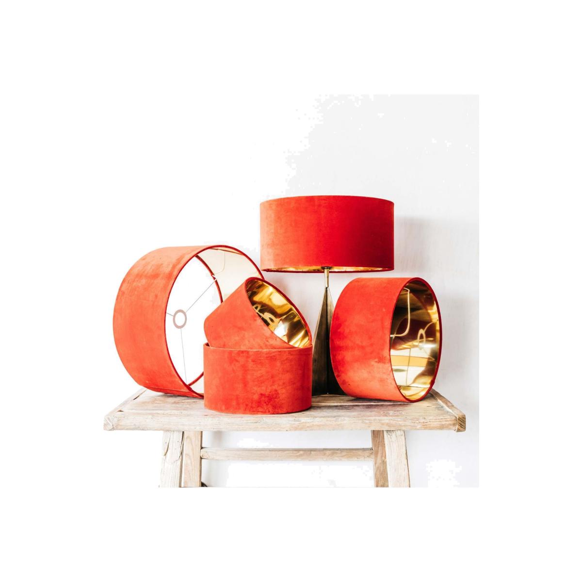 A collection of classic drum shaped shades, with a rich carnelian velvet exterior, hand-rolled edges and a shiny gold inner. Made in Dorset, any reusable off-cuts are donated to Somerset Scrapstore; a council-run project distributing materials to schools, nurseries and craft groups.