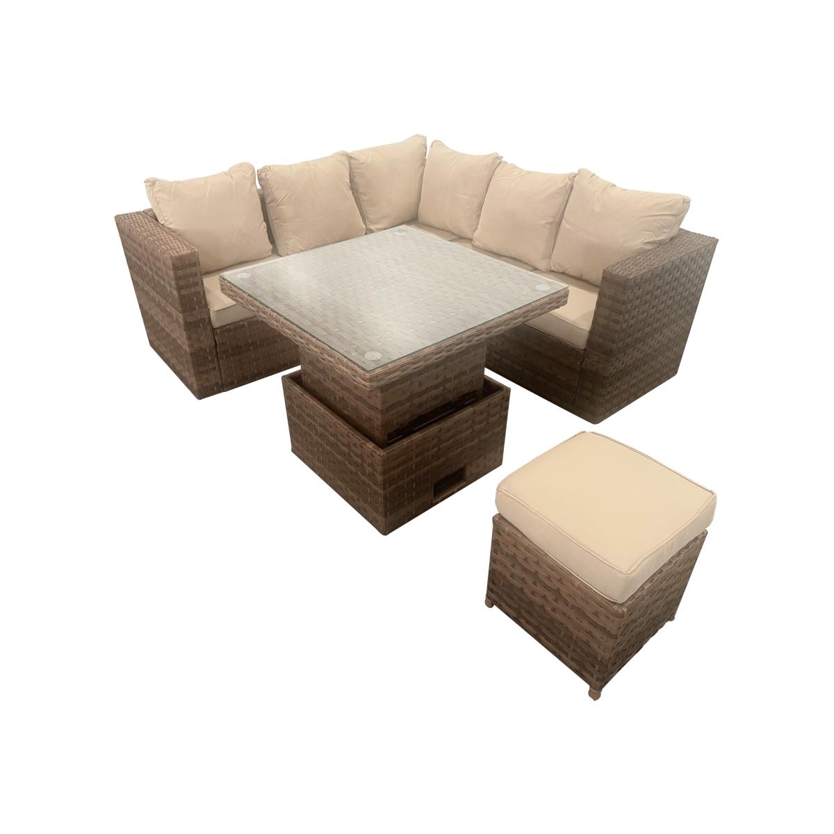 Get summer-ready and transform your garden into a stylish and functional space that you can't help but sit back and relax in with this Carolina Compact Conversation Set. Featuring a corner sofa, relaxing footstool and adjustable table, this set will cater to all your outdoor needs whether you are dining al fresco, catching up with friends or soaking up the sunshine. Boasting a trendy rattan design that protects against UV rays, ensuring it stays attractive throughout the years. Each sofa and stool is complete with super plush, inviting cushions to add a high comfort level. The height of the table can be adjusted for various uses from BBQs, snacks and refreshing drinks.