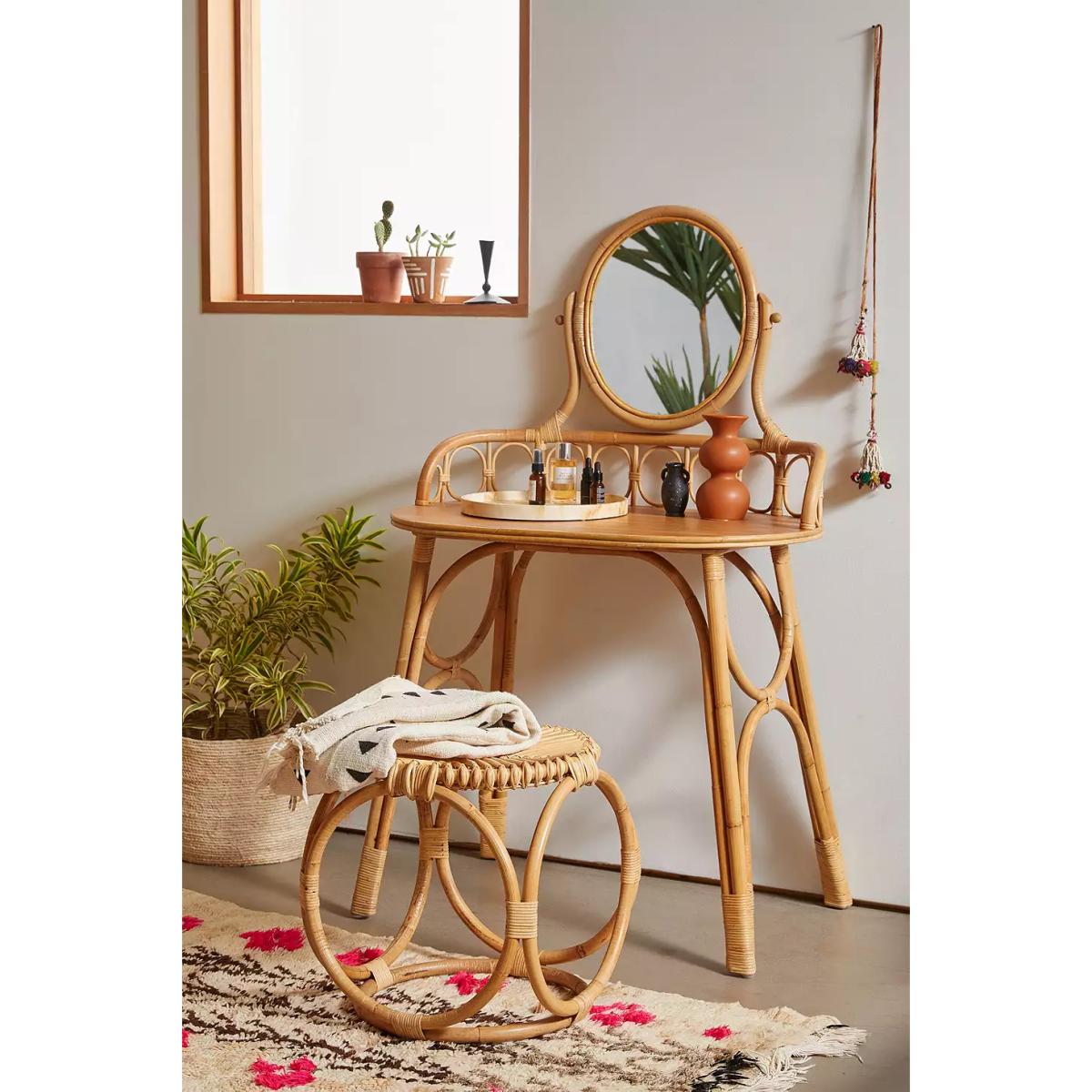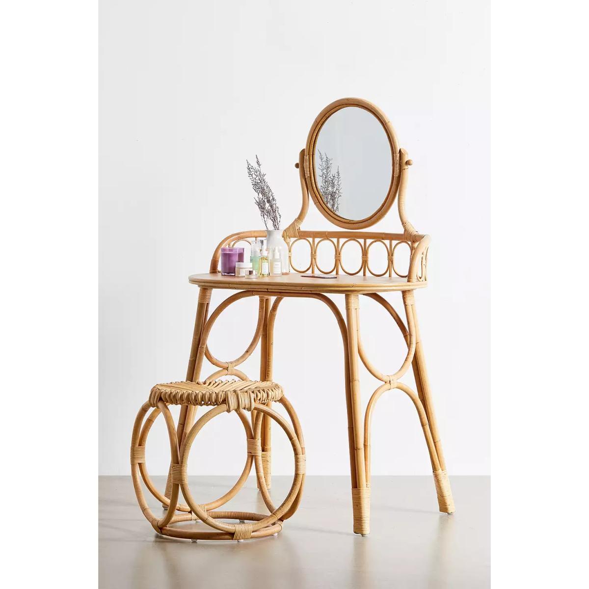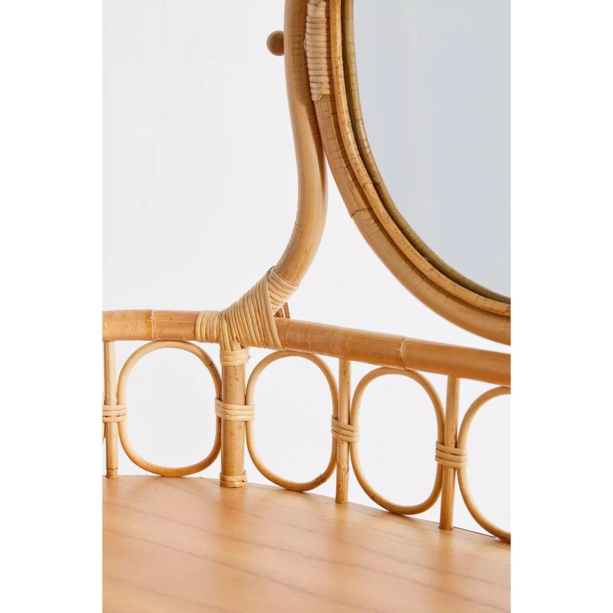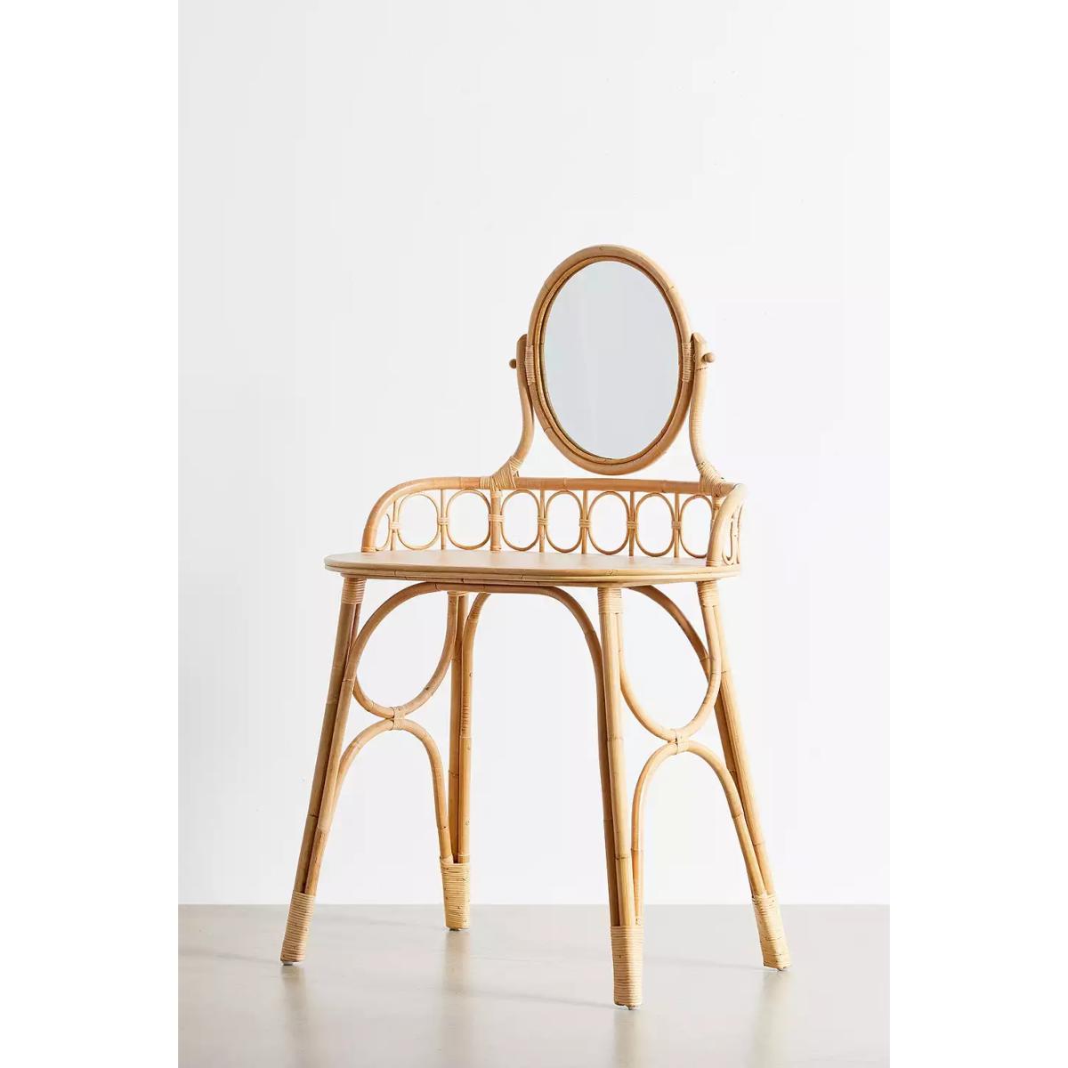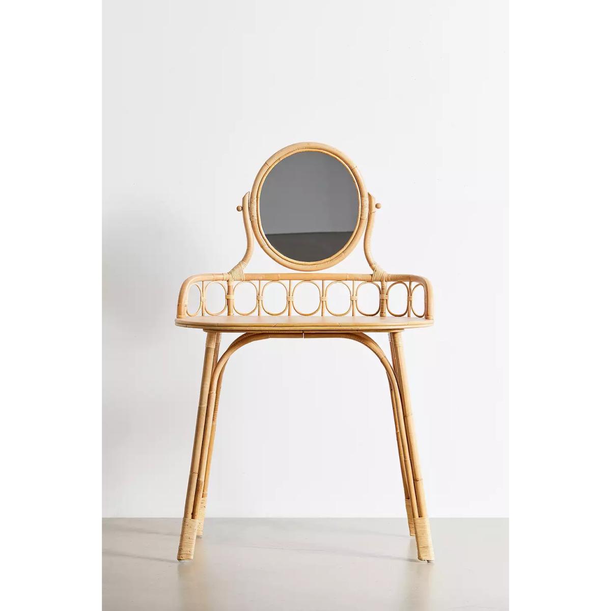 Beauty vanity table, perfect to have in the bedroom with daily jewellery and makeup essentials. Made from a rattan construction, features an oval built-in mirror and tabletop. _ Online return only. This item cannot be returned in-store. _ _Please note furniture items currently cannot be shipped to Northern Ireland or The Republic of Ireland. Delivery of large furniture items may take 2-3 weeks and are therefore not eligible for Next Day Delivery._ **Content + Care** \- Includes 1 x dressing table (stool not included) \- Assembly required \- Includes instructions and hardware \- Rattan, Mindi wood veneer, Mirror \- Wipe clean **Size** \- L: 83cm x W: 83.95cm 19.75"w x H: 136cm \- Leg height: 73cm (removable) \- Clearance height: 71.2cm \- 10.4Kg