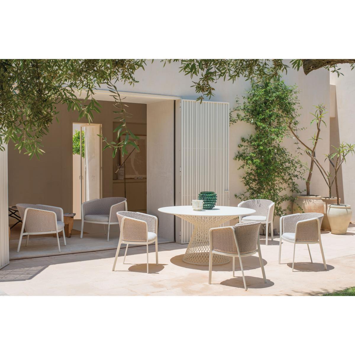 Contemporary braiding… Created by German designer Sebastian Herkner, the Carousel armchair collection revisits braiding in a more current, chic spirit. These armchairs combine a sleek aluminium structure with a synthetic fibre backrest braided in different ways. The Carousel collection establishes a harmonious dialogue between decorative braiding with a warm look and contemporary metal. The armrests form an aerial, graphic, enveloping frame which affirms the collection’s identity. In this version of the Carousel armchair, the very tight weave is similar to classic wicker weaving. Suitable for outdoor use, the Carousel armchair will just as easily find its place around a table as in a lounge area. Carousel is a versatile product able to express different styles and interpret the space it occupies in a unique way without altering its chromatic or aesthetic balance. PLEASE NOTE: The seat cushion visible in the picture is not included: it’s sold separately (contact us to order).