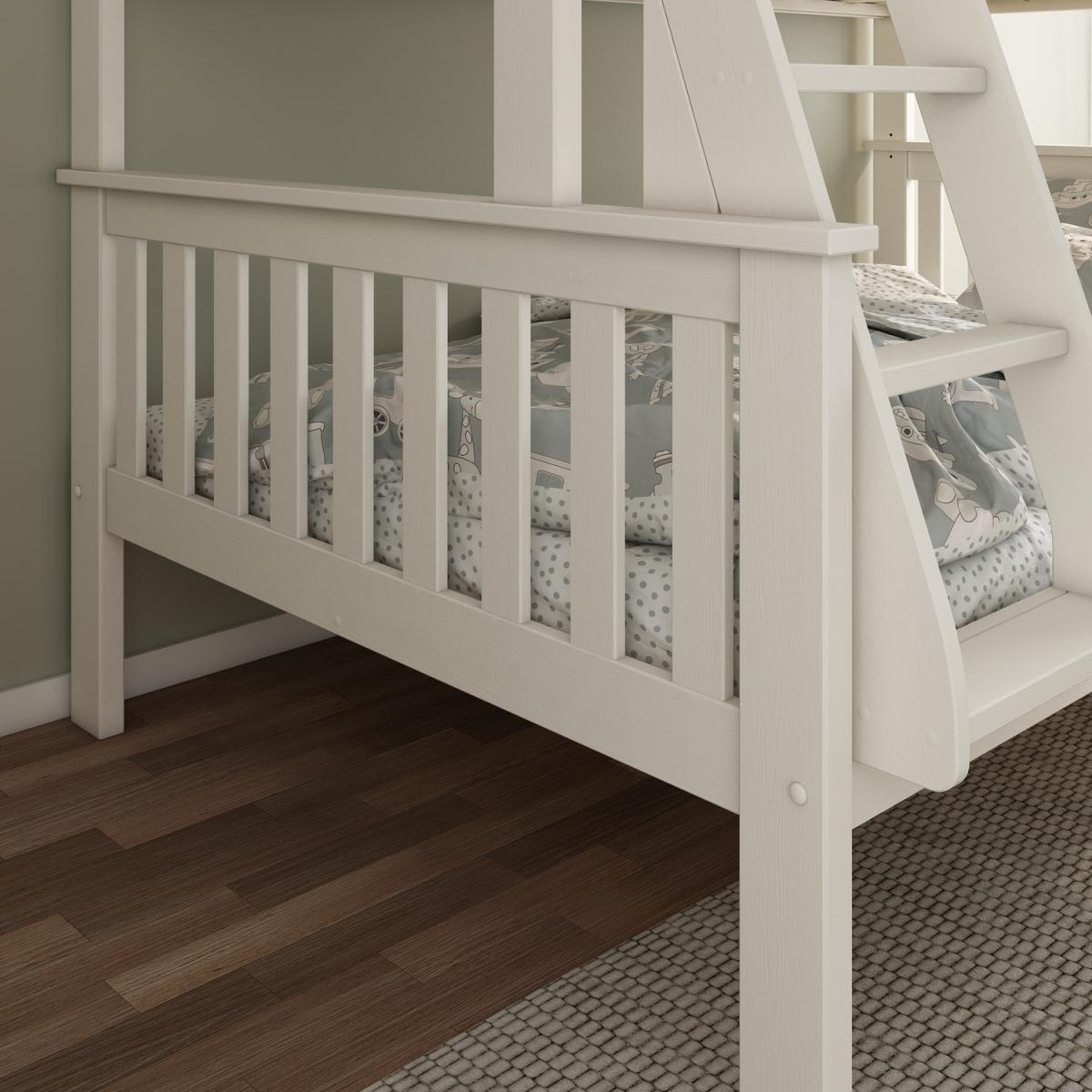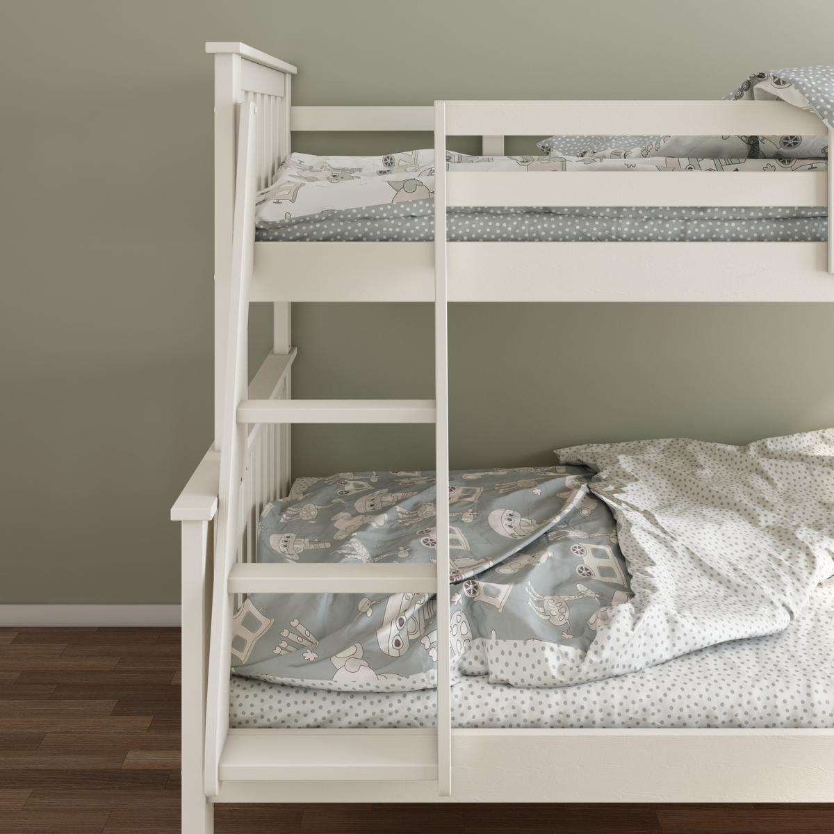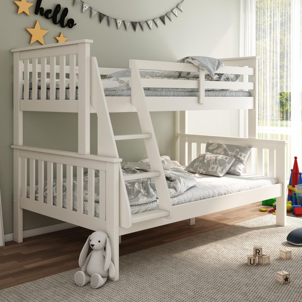 The Carra Triple Sleeper Bunk Bed is a modern bunk bed manufactured using quality Pine with a beautiful lacquered white or grey finish, which helps retain the fine qualities of the pinewood. There are 4 guard rails to the top bunk, 2 to either side which ensures safety for the top bunk sleeper. The ladder is adjustable to either the left or right-hand side, designed to suit any bedroom requirements. Complies with the requirements of UK bunk beds (Entrapment Hazards) (Safety Regulations 1987) and the European Standards (EN747-1). The headboard and footboard are both styled with vertical slats. This bed can easily be split and used as separate Single and Small Double beds. Mattresses are supported by a strong wooden slatted base for extra comfort. It is a perfect option for saving space and is ideal for both adults and children. Choose from our range of special Low Profile mattresses which are manufactured to fit perfectly in these types of beds without compromising on fillings.