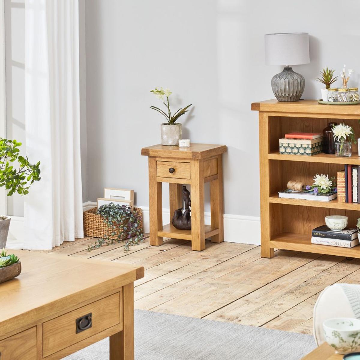 I love the Carrabba oak side table because of its simple, functional design and natural wood finish, which adds warmth and texture to a variety of interiors. It works particularly well in both contemporary and traditional living spaces, pairing nicely with neutral or colourfully upholstered furniture. Styling tips include using it as a bedside table or accent piece in a cosy nook, topped with a small lamp or decorative tray. The drawer provides handy storage for essentials, while the lower shelf offers space for books or greenery. Its versatile size makes it an easy fit next to a sofa or armchair, and its understated style means it won’t overpower other design elements in the room.