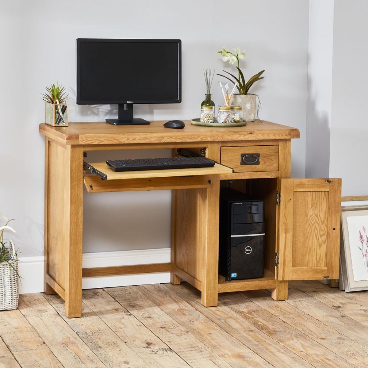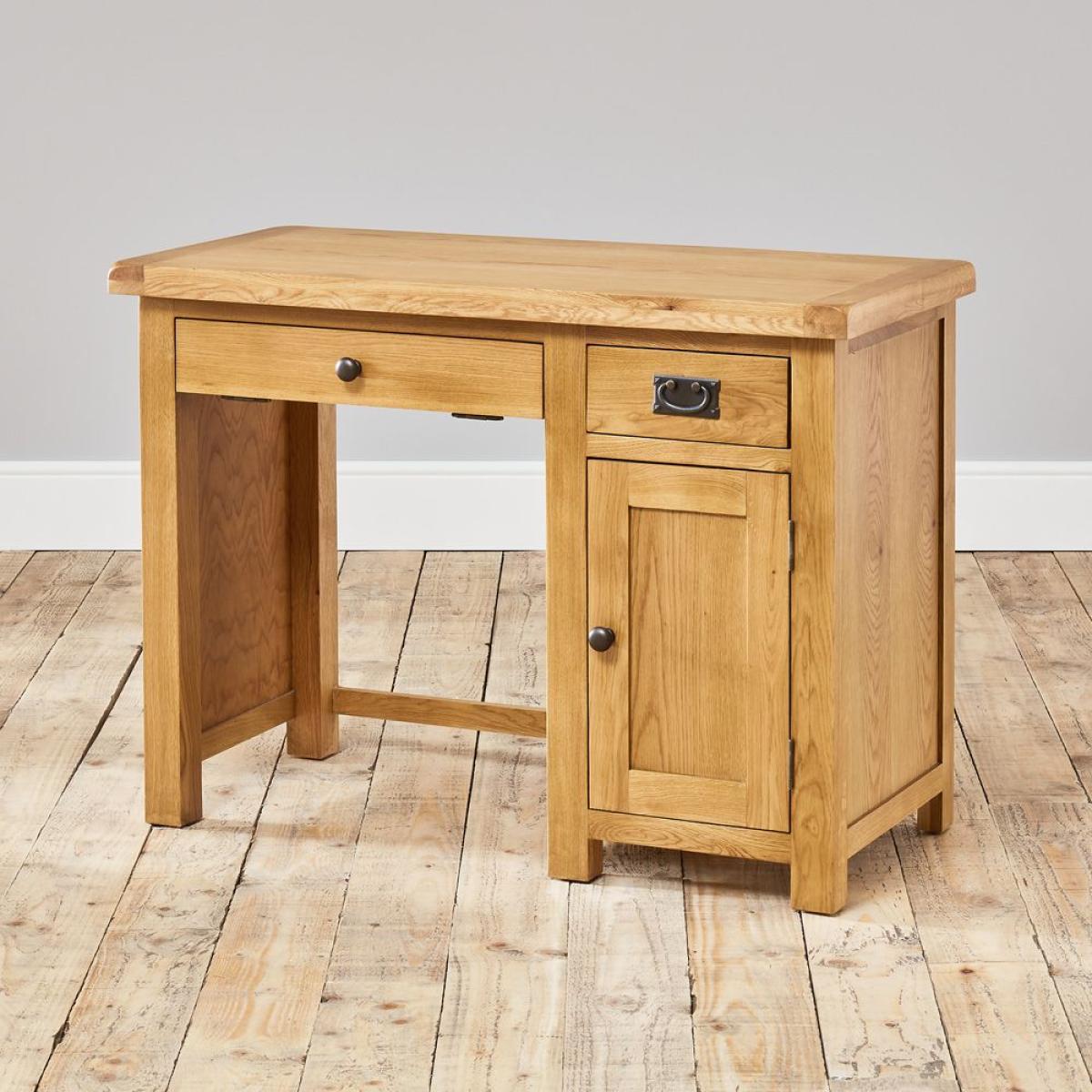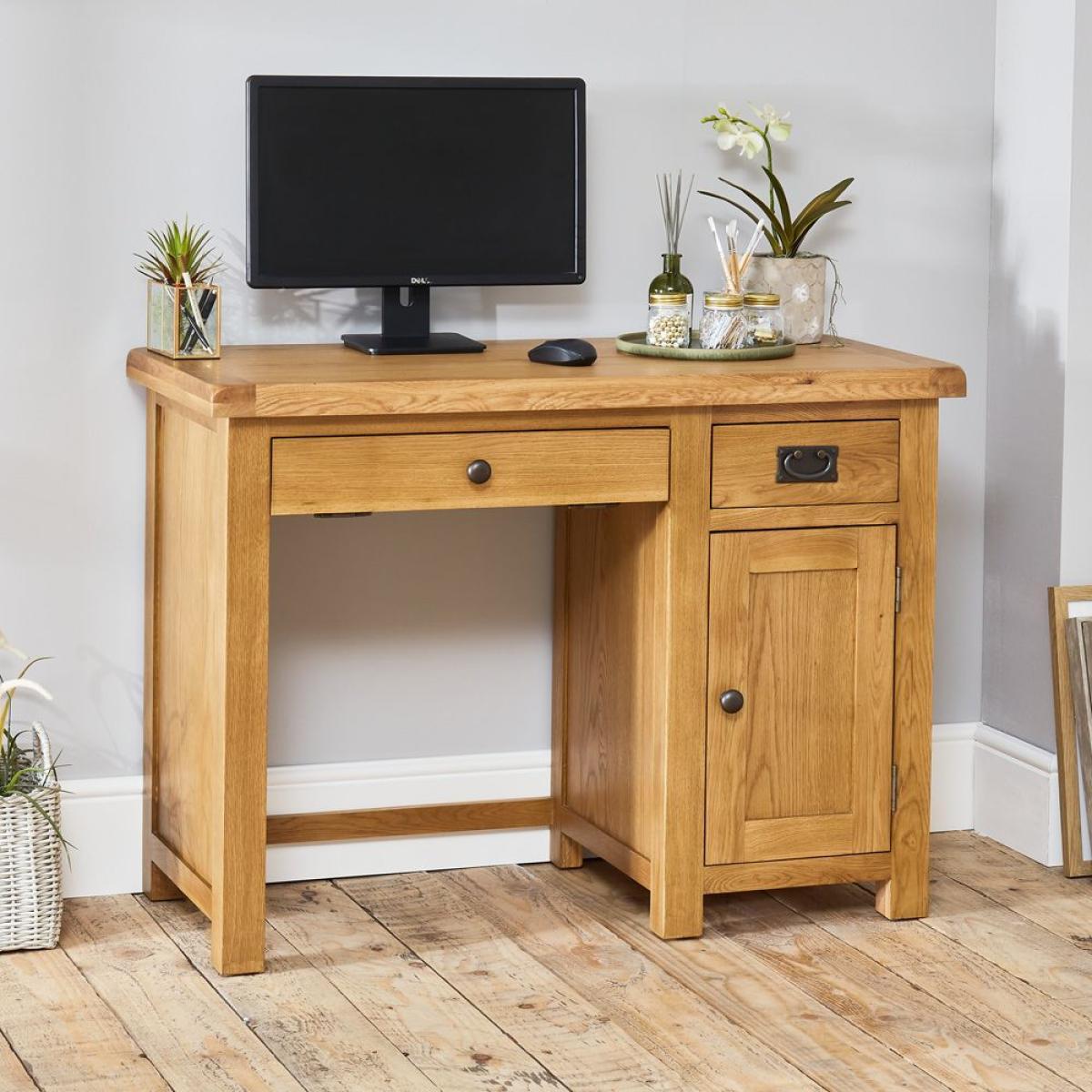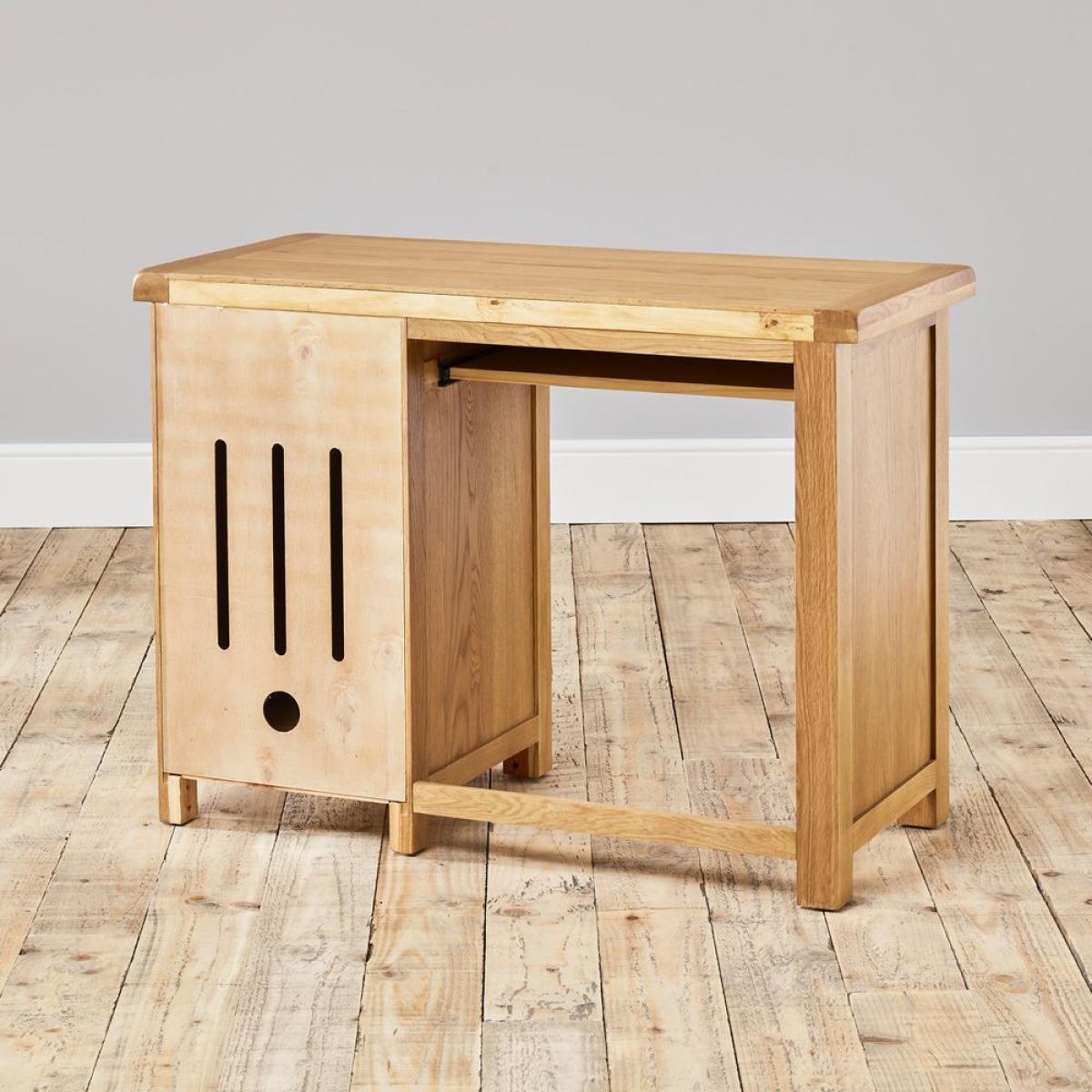The Carrabba Oak single desk is a versatile piece well-suited for both traditional and contemporary interiors, thanks to its warm, medium oak finish. I love how its simple, sturdy design complements various colour palettes and adds a natural touch to any room. It works particularly well in cosy home offices or multifunctional spaces where practicality is key. To style it effectively, consider adding a sleek desk lamp, organising your stationery with minimal organisers, and incorporating some greenery or decorative accessories for visual interest. Keep clutter to a minimum to maintain a clean, streamlined look that highlights the desk’s timeless charm.