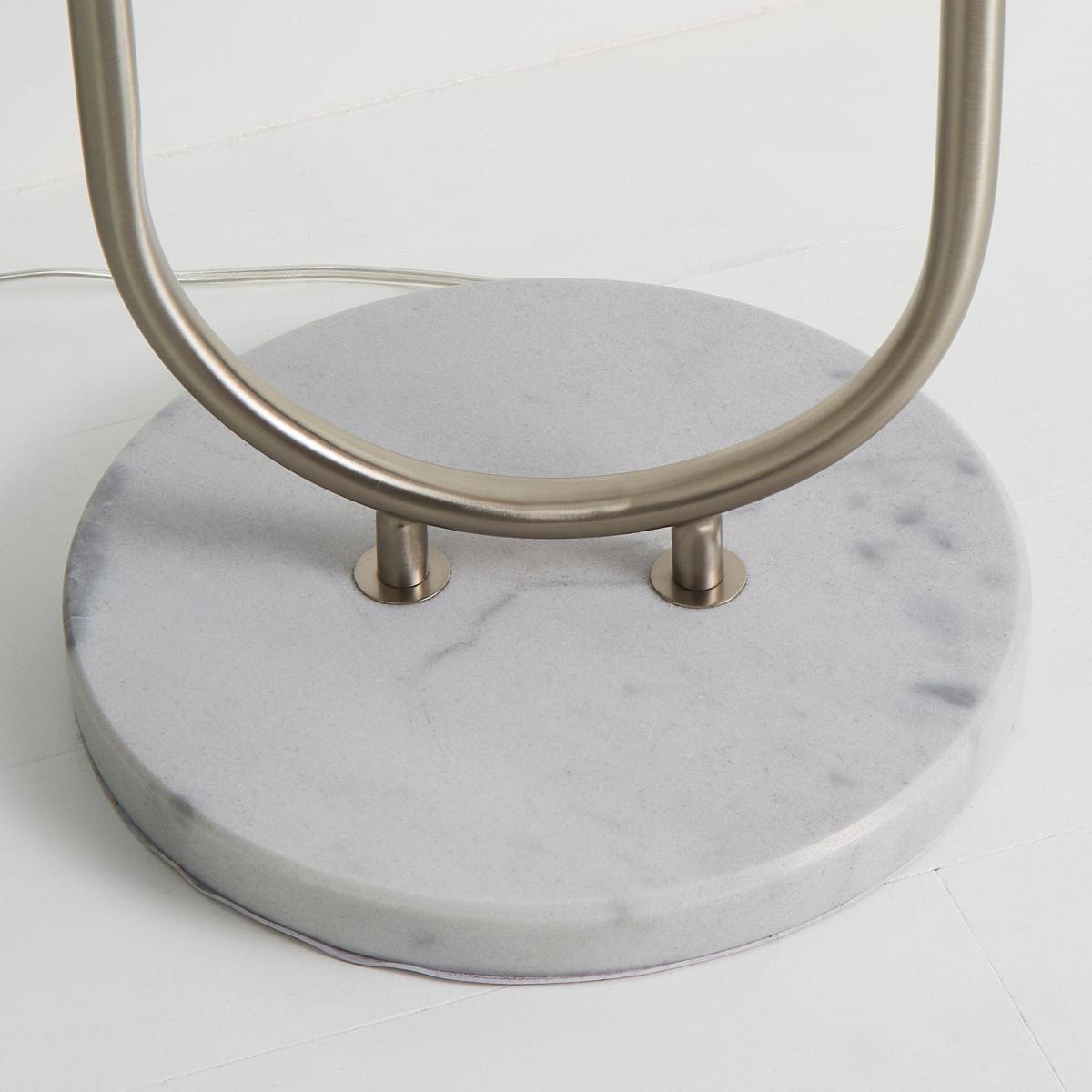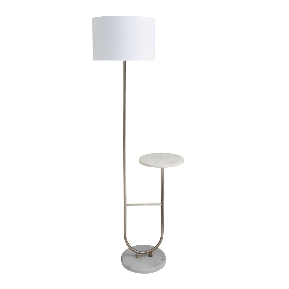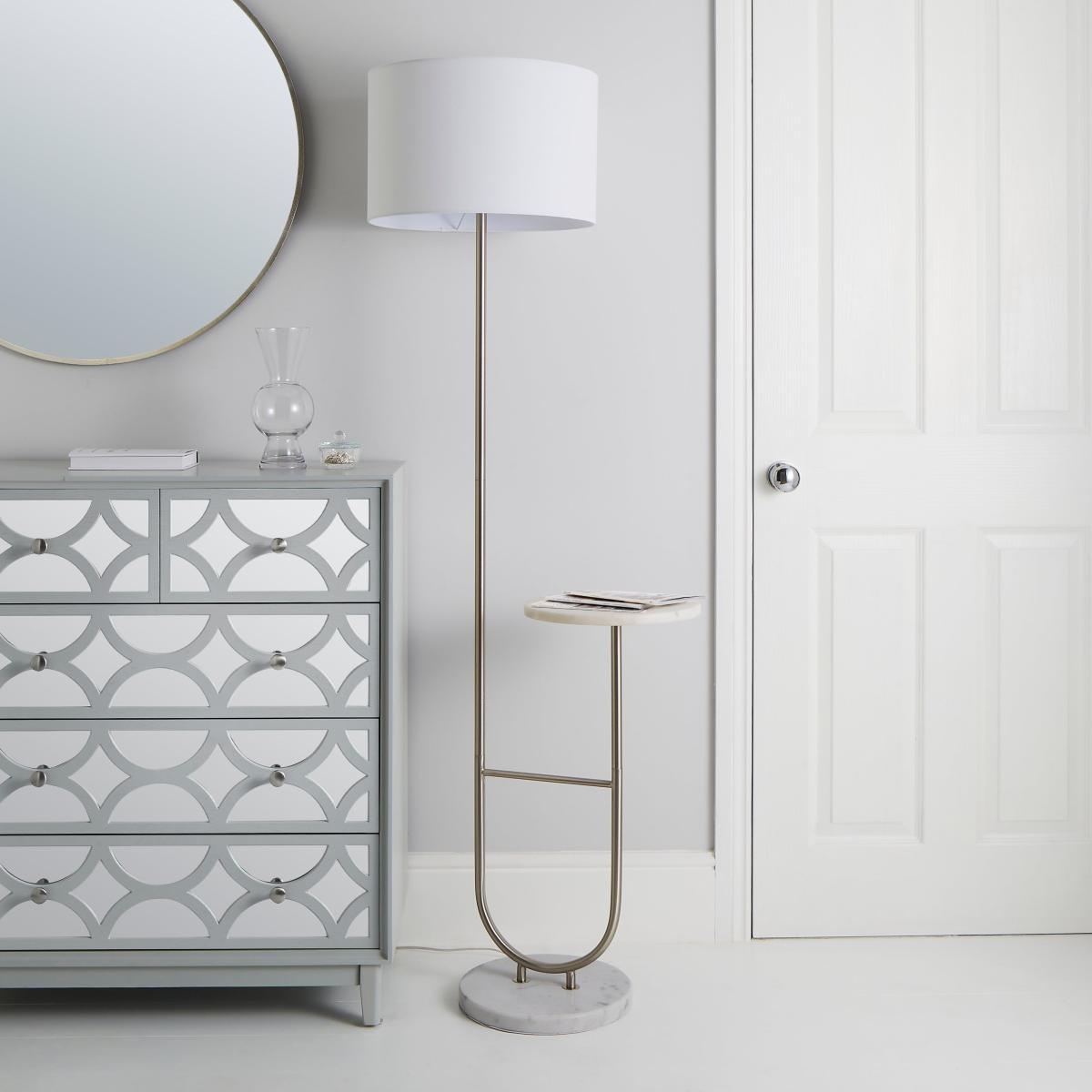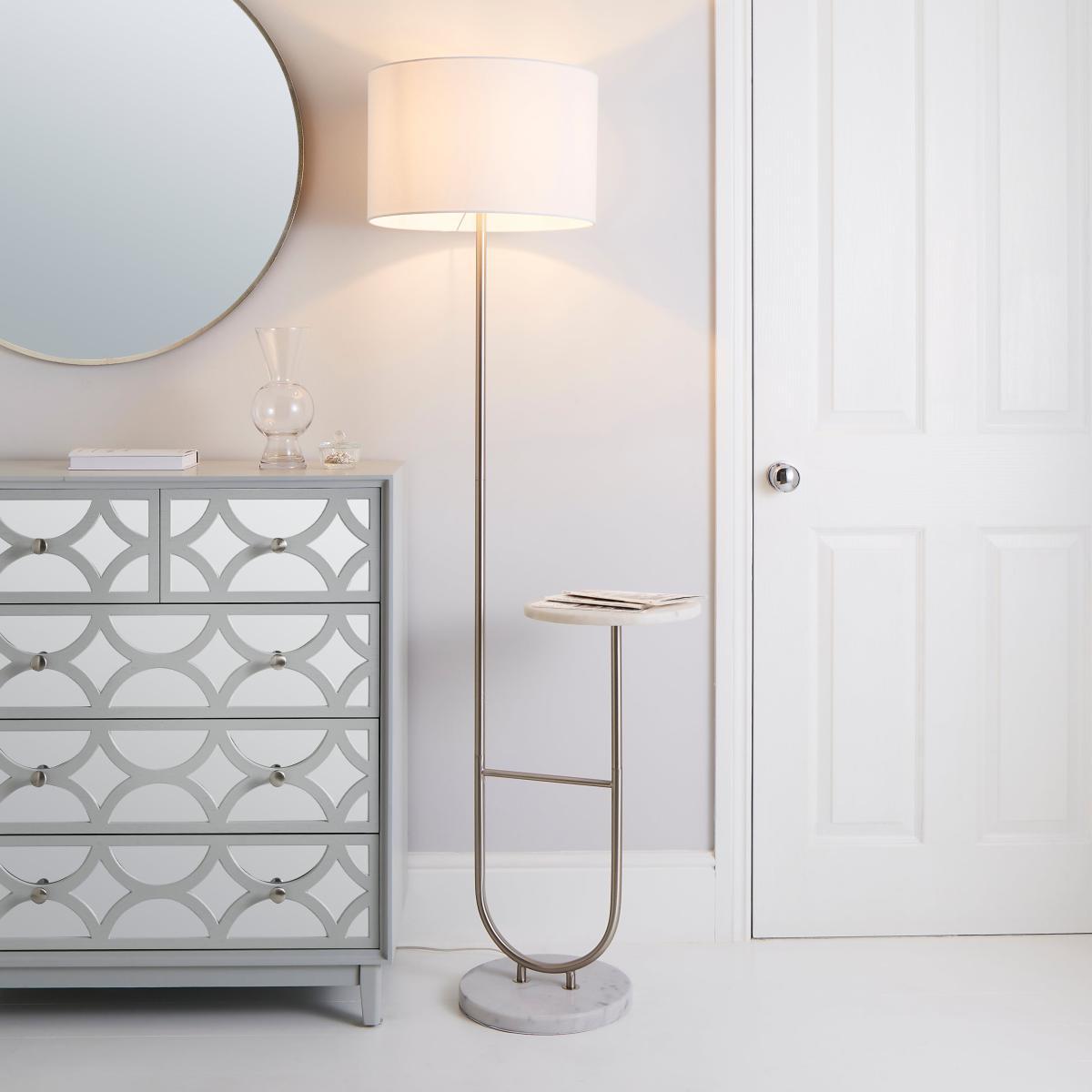 Featuring the stunning Carrara Marble Multi-Functional Table and Floor Lamp, beautifully crafted with a marble table top and base, finished with satin Silver metal work and a White Cotton mix cylinder shade. This unique piece is both practical and stylish, perfect for adding a luxurious touch to your home décor.