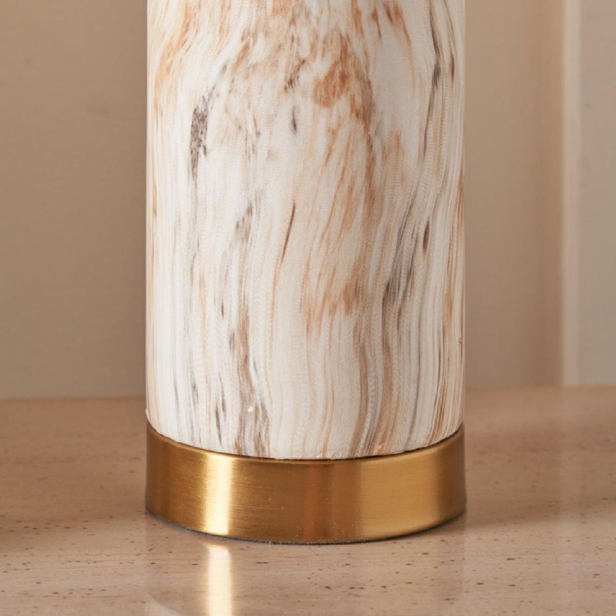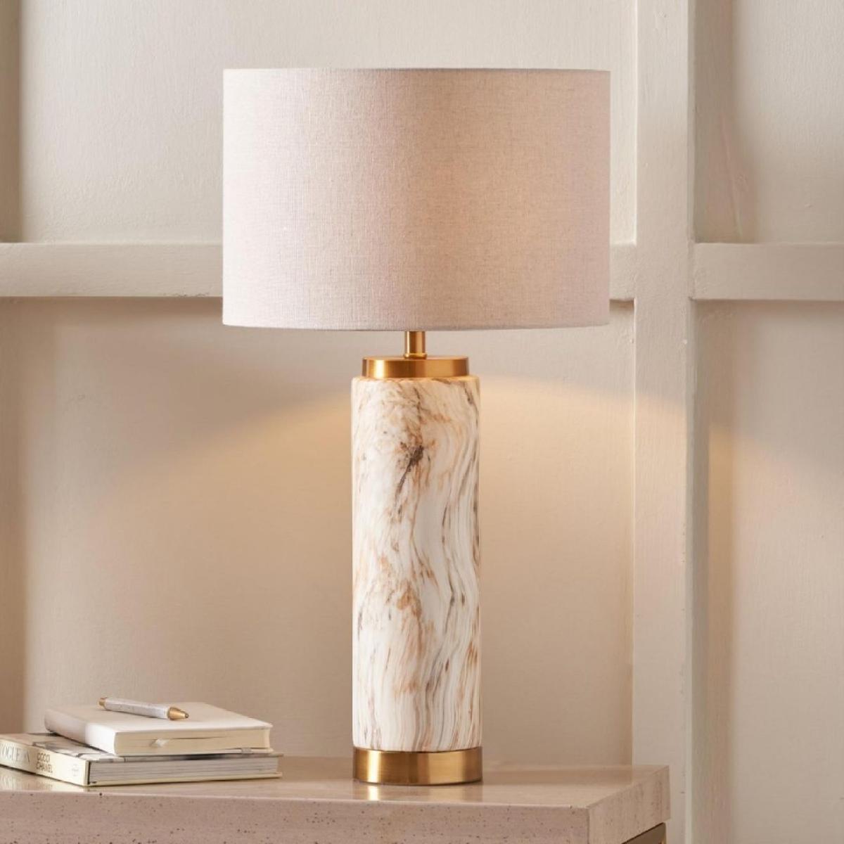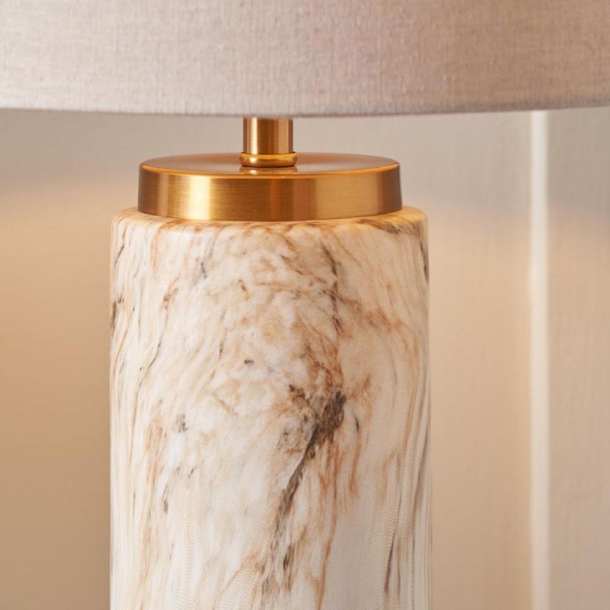 Carrara tall 1-light ceramic table lamp, featuring a white marble-effect base, gold metal detailing and a white, faux-cotton drum shade. Exuding timeless luxury with its elegant white marble-effect base, the sleek design of the Carrara table lamp is enhanced by gold metal detailing, adding a touch of sophistication and subtle glamour to the overall aesthetic. This stylish combination of marble and metallic accents makes the Carrara table lamp a standout piece that elevates any room. Topped with a crisp white drum shade, the lamp offers a soft, ambient glow that complements its refined design. The clean lines of the shade and the luxurious marble-effect base create a harmonious balance, making this lamp perfect for living rooms, bedrooms or hallways in need of a chic, contemporary touch. Carrara tall 1-light ceramic table lamp, featuring a white marble-effect base, gold metal detailing and a white, faux-cotton drum shade. Exuding timeless luxury with its elegant white marble-effect base, the sleek design of the Carrara table lamp is enhanced by gold metal detailing, adding a touch of sophistication and subtle glamour to the overall aesthetic. This stylish combination of marble and metallic accents makes the Carrara table lamp a standout piece that elevates any room. Topped with a crisp white drum shade, the lamp offers a soft, ambient glow that complements its refined design. The clean lines of the shade and the luxurious marble-effect base create a harmonious balance, making this lamp perfect for living rooms, bedrooms or hallways in need of a chic, contemporary touch.