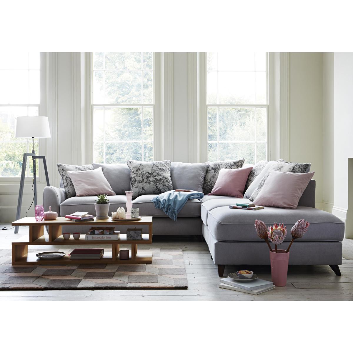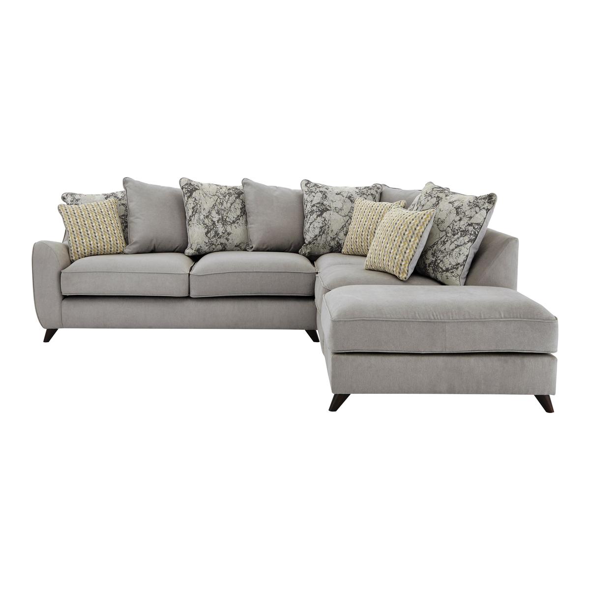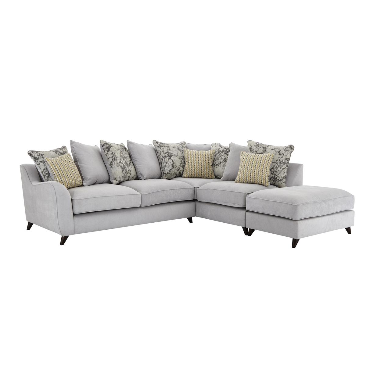 It’s easy to unwind and relax on the gorgeous Carrara corner chaise pillow back sofa. It’s seamlessly stylish, with softly curving arms, attractive piping detailing and splayed wooden legs in dark wood – for a light wood finish simply call 0800 804 8879. Relax and enjoy the comfort of soft yet supportive foam seat cushions and serpentine spring seat and back suspension. Thanks to the footstool you can create a roomy chaise and really stretch out in style. This large and roomy pillow back corner chaise sofa has soft fabric upholstery in a choice of subtle neutral shades, with the pillow backs including vibrant accent patterns. There are nine large pillow back cushions – four with plain fabric back and front and plain piping, and five that are reversible, with a patterned front, plain back and plain piping. You can also, if you wish, buy additional reversible scatter cushions in a choice of vibrant accent patterns, available separately. The Carrara corner chaise pillow back sofa with footstool is part of the flexible, modular Carrara collection. Top Tip: To keep your fabric sofa or chair looking good, plump the seat and back cushions and any scatter cushions regularly, and – where possible – turn and rotate to ensure even wear. Plumping and rotation is important as interiors settle over time, and some fabrics can show wear on areas of more use or in direct sunlight. Using a soft brush or vacuuming with the curtain attachment weekly prolongs the life of fabric upholstery. Ideally clean professionally annually.