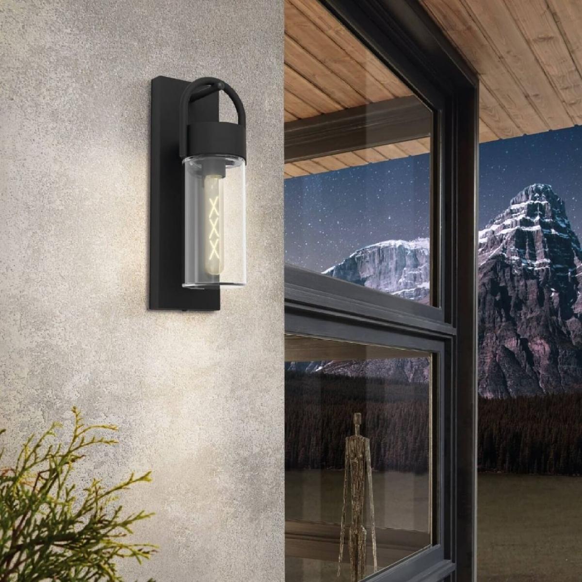 The Carraro outdoor wall lamp features a steel wall bracket in a black finish, with a clear glass cylinder which is hung from the wall bracket via a round handle. The glass cylinder offers a clear view of the illuminant with an exposed lightbulb design. The outdoor lamp is perfect for outdoor environments with an IP44 rating, making it splash and spray-proof. The fixture's modern style complements any outdoor space, whether illuminating a patio area or porch. The outdoor wall lamp requires 1 x E27 lightbulb, which is not included. The Carraro outdoor wall lamp features a steel wall bracket in a black finish, with a clear glass cylinder which is hung from the wall bracket via a round handle. The glass cylinder offers a clear view of the illuminant with an exposed lightbulb design. The outdoor lamp is perfect for outdoor environments with an IP44 rating, making it splash and spray-proof. The fixture's modern style complements any outdoor space, whether illuminating a patio area or porch. The outdoor wall lamp requires 1 x E27 lightbulb, which is not included.
