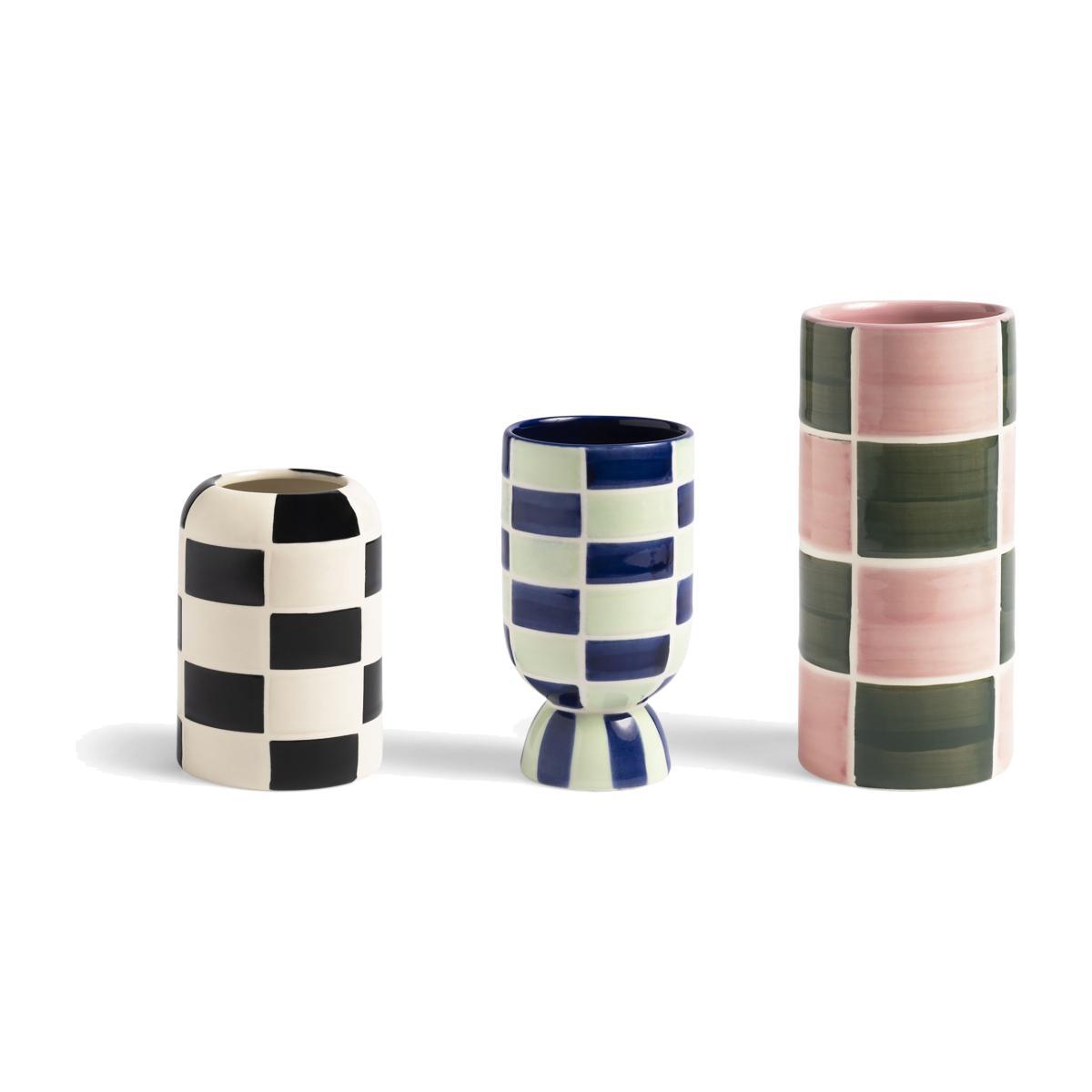 An ultra-graphic effect is guaranteed with these joyful and colourful vases. Geometric patterns are combined with a wonderful colour palette of vibrant, acidulous tones. This set consists of three ceramic vases boasting a stunning harmony of shapes and colours. They can be assembled to create an elegant yet eccentric composition.