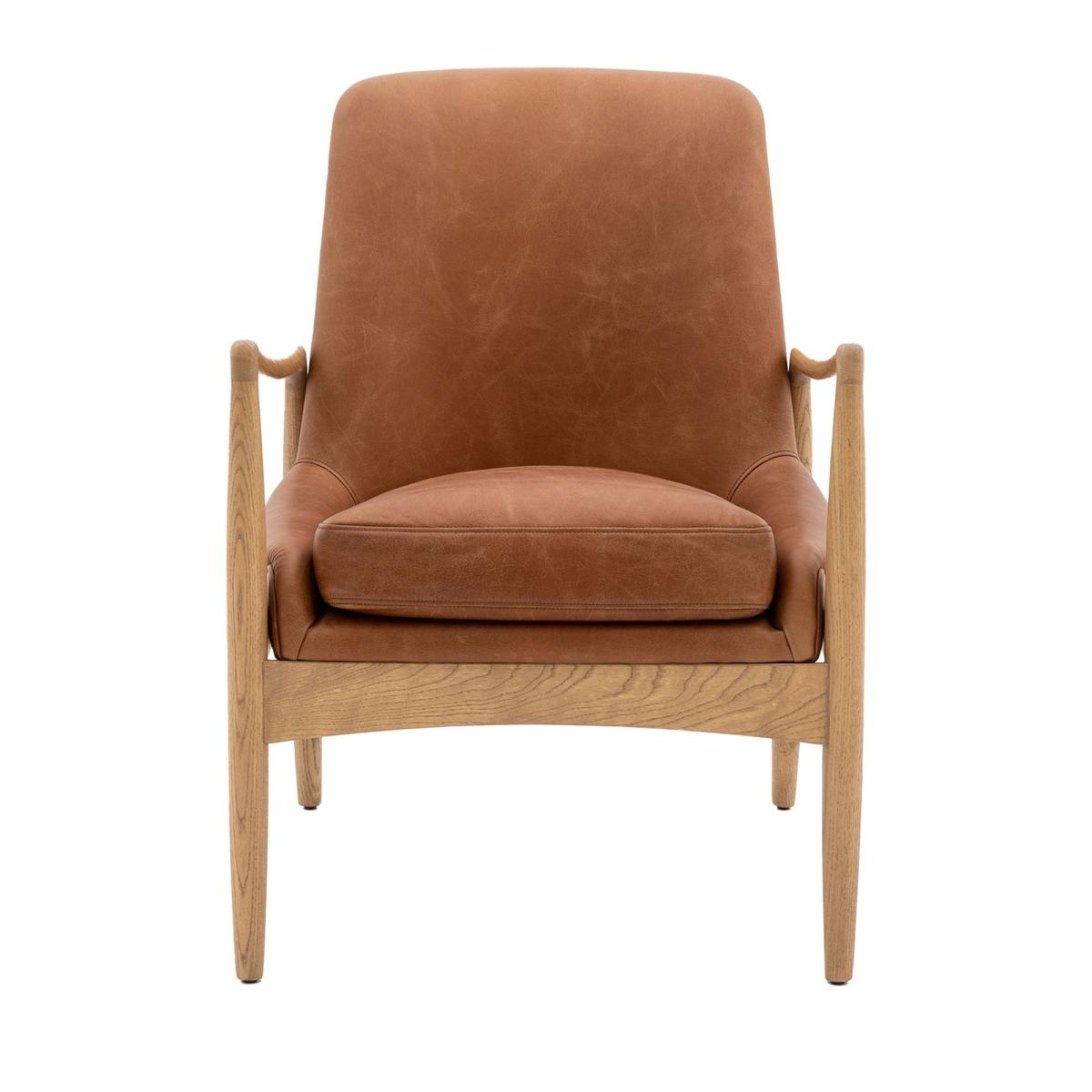 Offering an contemporary twist on mid-Century style, this beautiful chair will suit a wide range of interiors. The oak frame with its natural weathered finish is perfectly complementd by the brown leather. The padded back and seat cushion adds extra comfort to the chair.