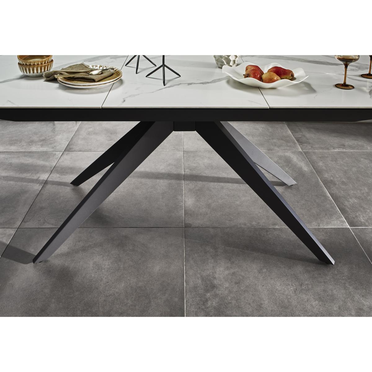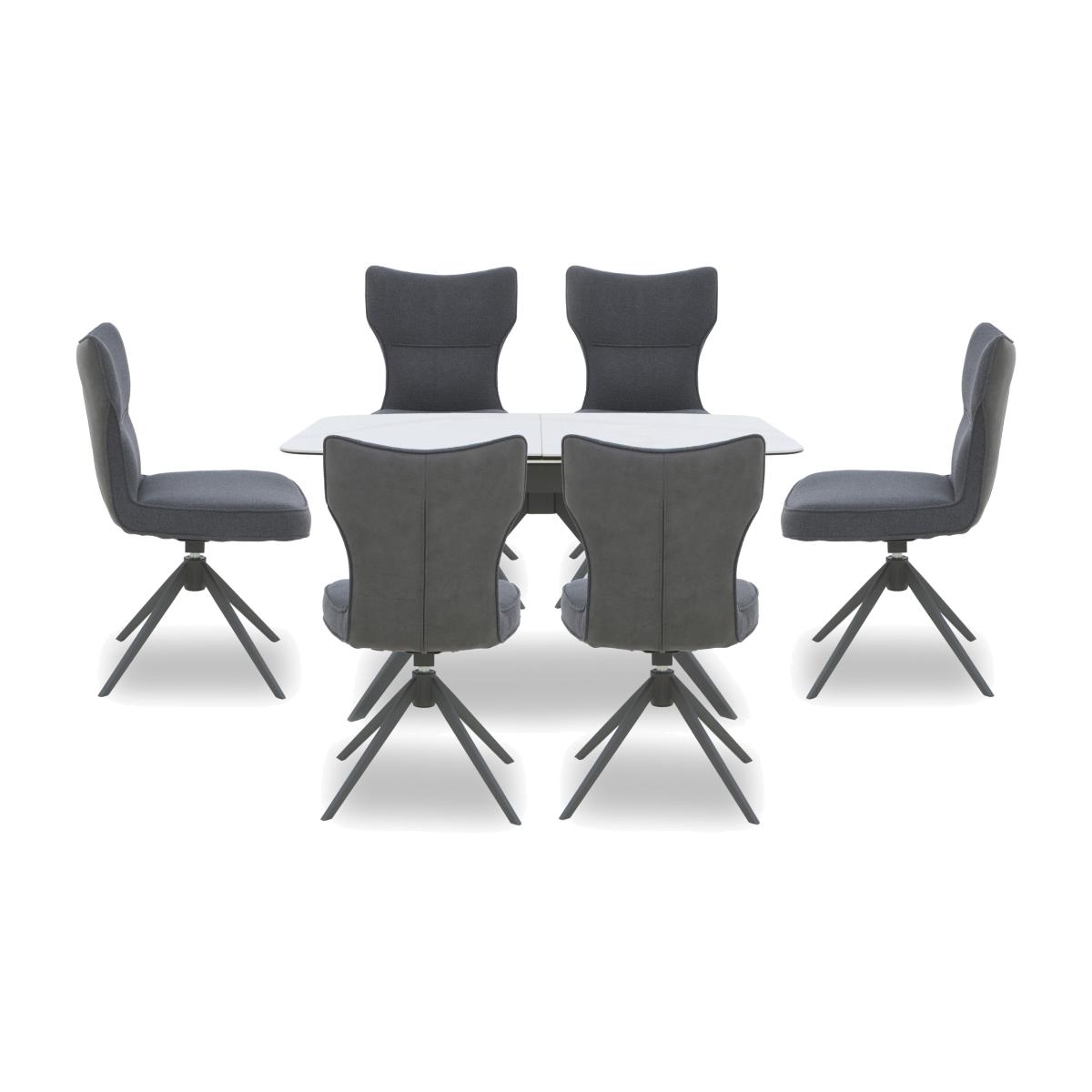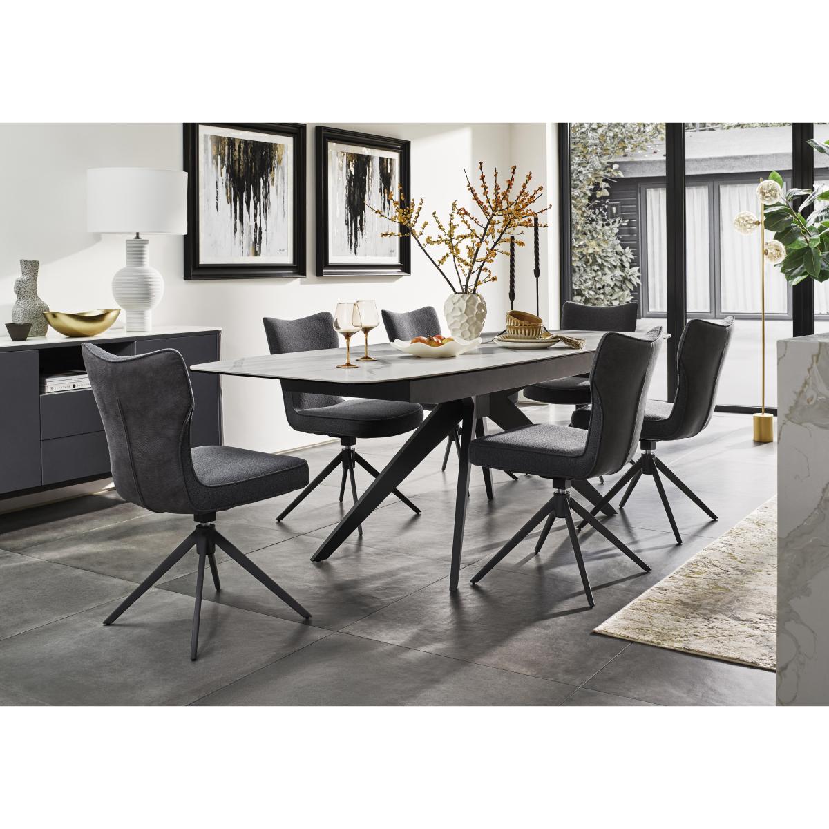 Cool dining style meets well- crafted elegance in our Carrera range. The extending dining table in this dining set has a beautiful white ceramic top with a marble veining pattern. With six striking dining chairs. Why you'll love it Sleek, smooth and sophisticated, our Carrera ceramic dining furniture is absolutely stunning. This extending dining table in this dining set has a boat- shaped ceramic top. Modern matt finish with a satin- soft feel and beautiful marble- style veining. The ceramic top is bonded to black glass – a cool look that makes this dining table extra durable. Ceramic is also heatproof, scratch- resistant and chip- resistant. The guest- friendly pop- up mechanism extends this table in seconds. Stylish spider leg metal base in dark grey. This dining table is available in 2 sizes. With a set of 6 striking dining chairs. Chairs have super- comfy pocket sprung seats. 360- degree swivel bases with auto- return function. Splayed metal legs have a fashionable powder- coated finish in dark grey. In a choice of upholstery fabric colours. Exclusively available at Furniture Village. This dining set is part of our Carrera range. What you need to know Chairs have metal frames and swivel bases, and are cushioned with pocket springs and foam. Table top is 6 mm ceramic bonded on 6 mm glass. Iron frame and legs. 140 cm dining table seats 6 closed and extends to 170 cm to seat 8. 180 cm dining table seats 8 closed and extends to 240 cm to seat 10. Please note that when this table is extended, the marble patterning of the extension leaf will not match the other leaves. We recommend using coasters and placemats at all times. Easy to care for. Simply wipe with a clean, slightly damp cloth.