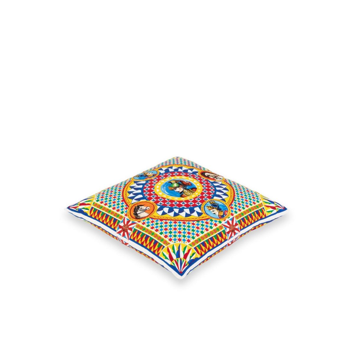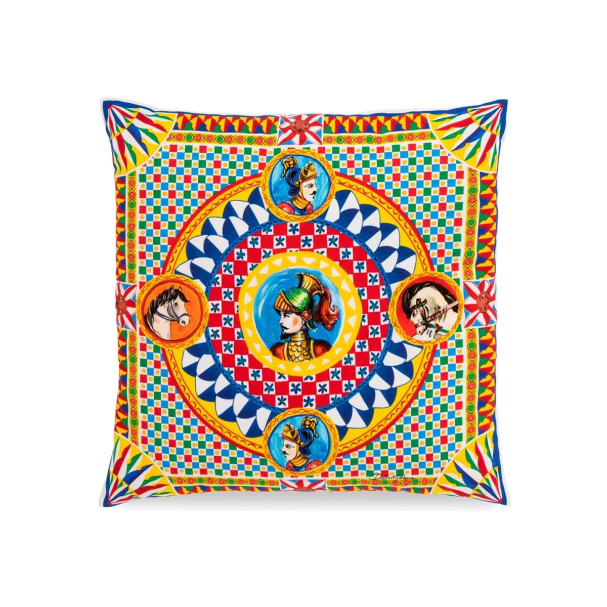 Add a burst of colour to a favourite chair or sofa with this striking, small-sized canvas cushion from Dolce & Gabbana Casa, showcasing a folklore-inspired, vibrantly hued Carretto Siciliano design found throughout the brand’s collection.