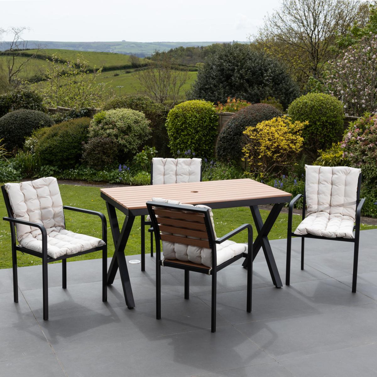 Elevate your outdoor entertaining with the Carrick Patio Table and Chair Set, a stylish and practical addition to any garden or patio. This set includes a 130 x 70cm rectangular dining table standing at a height of 75cm, providing ample space for outdoor drinks and dining with family and friends. Crafted with durability in mind, the Carrick set features a powder-coated metal frame that ensures stability and longevity, even in outdoor environments. The table and chairs are topped with solid PS wood effect plastic, offering the timeless look of wood with the low maintenance benefits of plastic. With four matching chairs included, this set is perfect for gatherings and outdoor meals. The chairs are designed for comfort and durability, allowing you to relax and enjoy the outdoors in style. Whether you're hosting a barbecue or simply enjoying a morning coffee in the sunshine, the Carrick Patio Table and Chair Set provides the perfect setting. There is a central hole in the table for an umbrella or parasol. Designed for convenience, this set is delivered with quick and efficient service, ensuring that you can start enjoying your outdoor space without delay. Transform your garden or patio into an inviting oasis with the Carrick Patio Table and Chair Set - where style meets functionality and every outdoor gathering becomes a memorable occasion. The standard product is the table and 4 chairs however you can upgrade this to include water resistant seat cushions for the chairs.