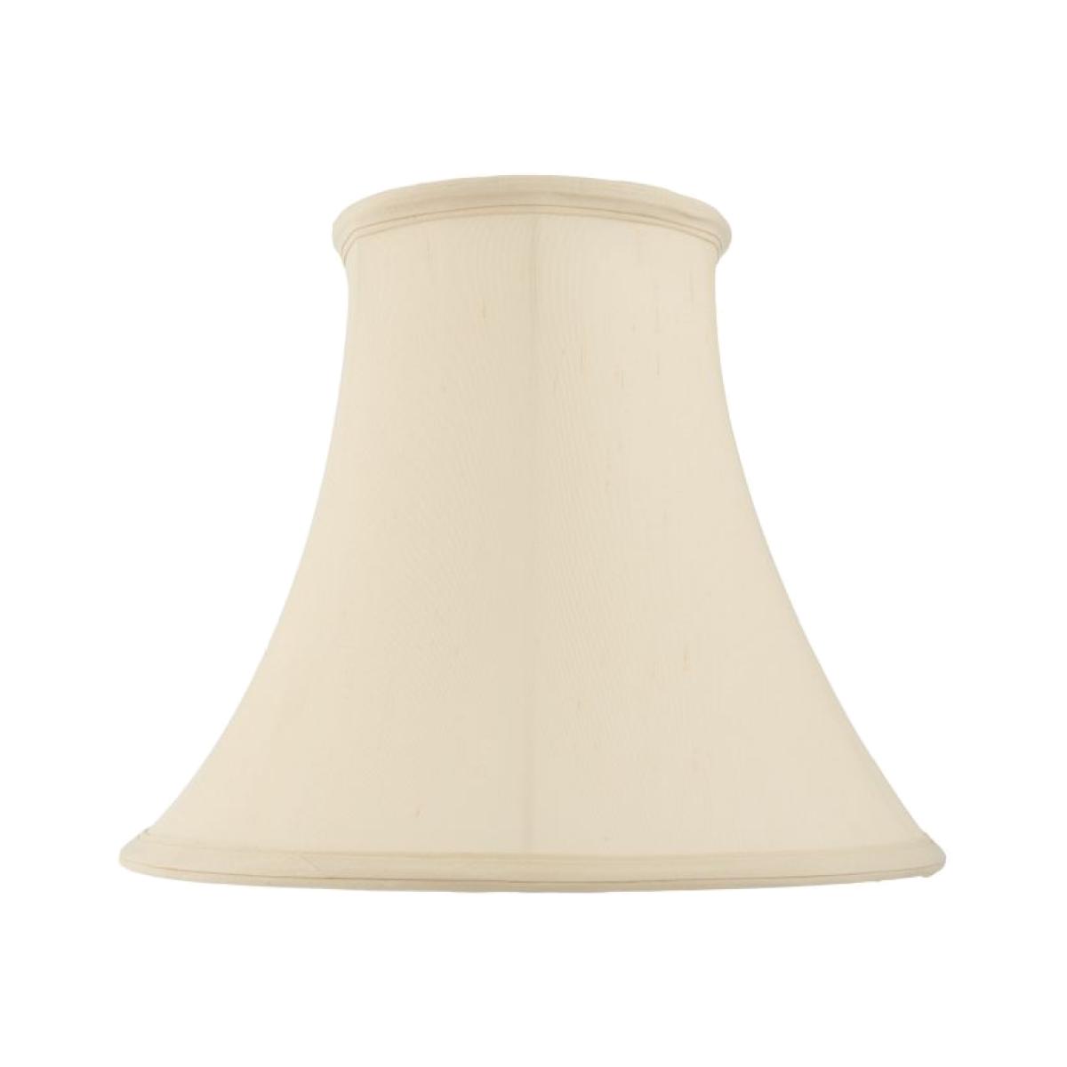 This 14 inch handmade cream lamp shade is shaped in a round bell design and has a double folded trim on the top and bottom. For use with a variety of lamp bases and available in a choice of sizes. Note - this shade has a fixed gimbal and is not suitable for use with pendants.