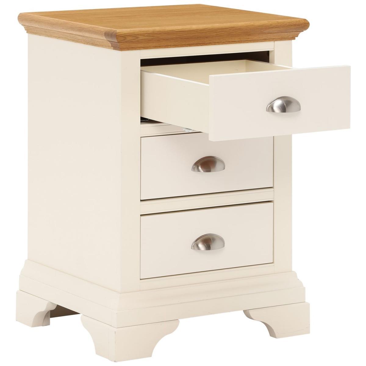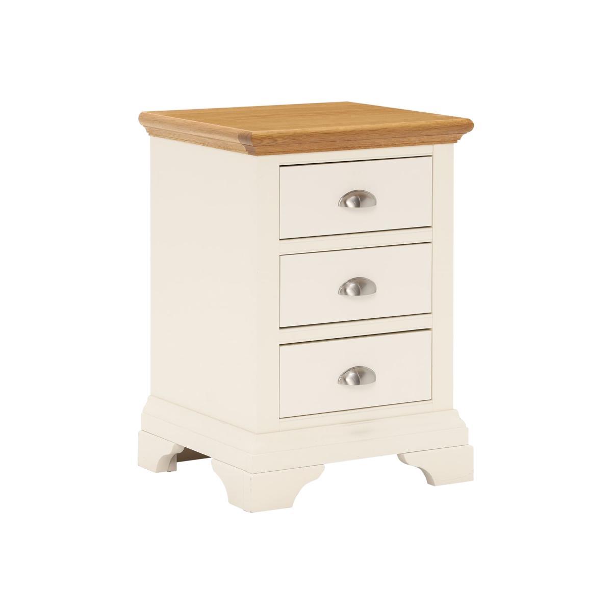 Design. For a traditional look with a modern twist, Carrington is the perfect choice. The Carrington 3 Drawer Nightstand features contrasting ivory and oak for a subtle statement. Classic bracket feet and superior quality brushed steel handles offer a timeless feel, while 3 soft close drawers offer an abundance of storage. An essential piece for any Scandinavian inspired or modern bedroom.