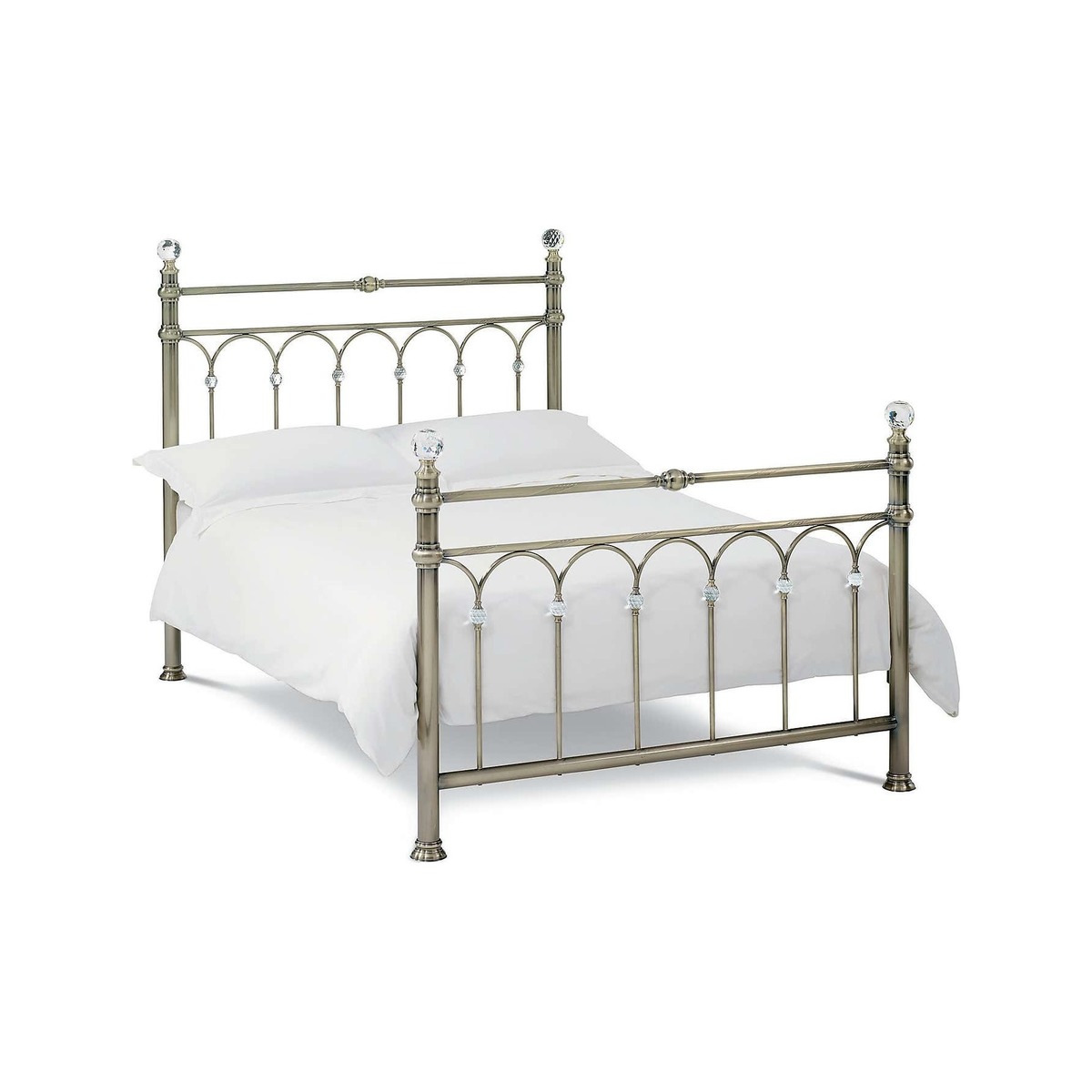 Crafted in metal with a slatted frame and an antique brass gloss finish, this easy to assemble bedstead features curving bars and crystal sphere details.