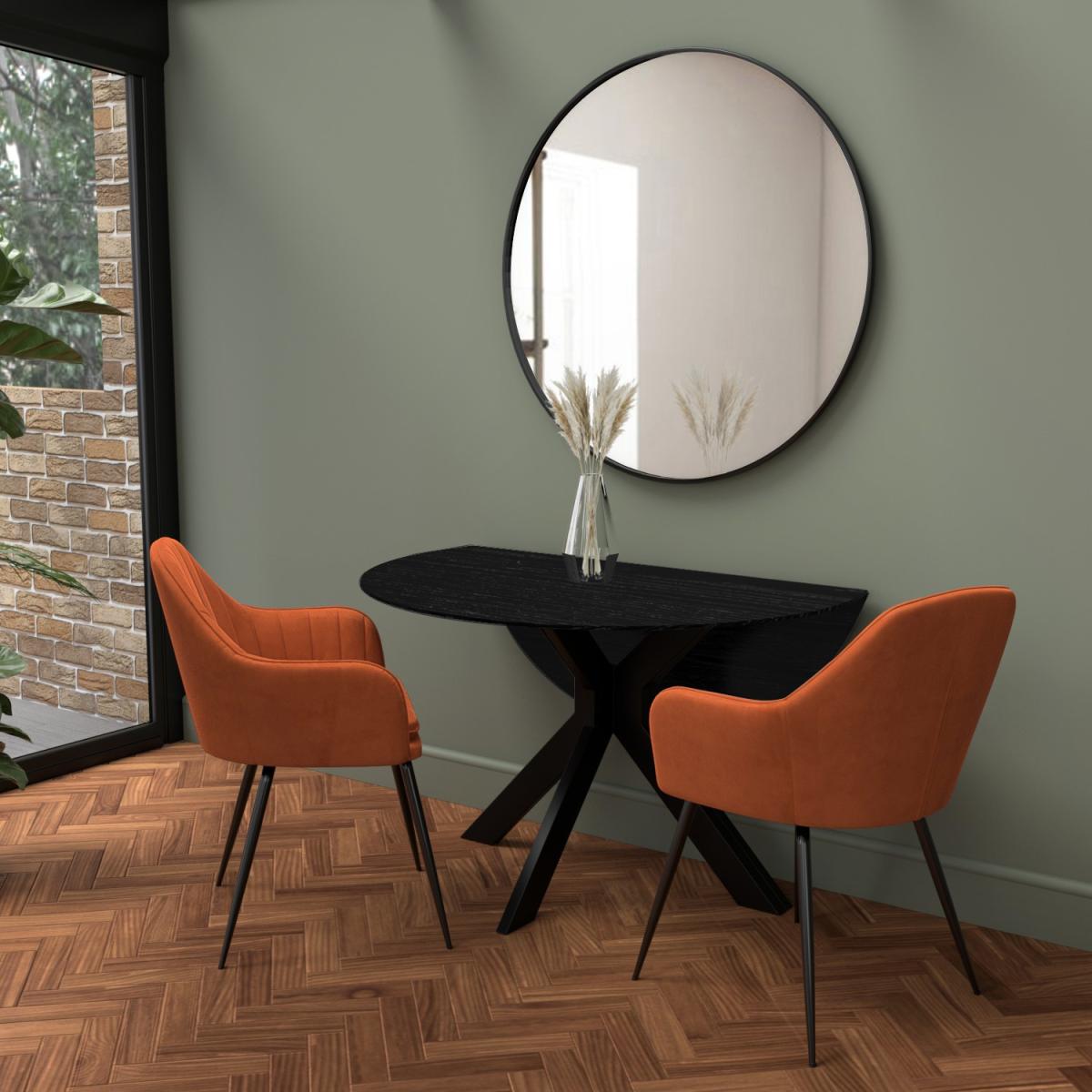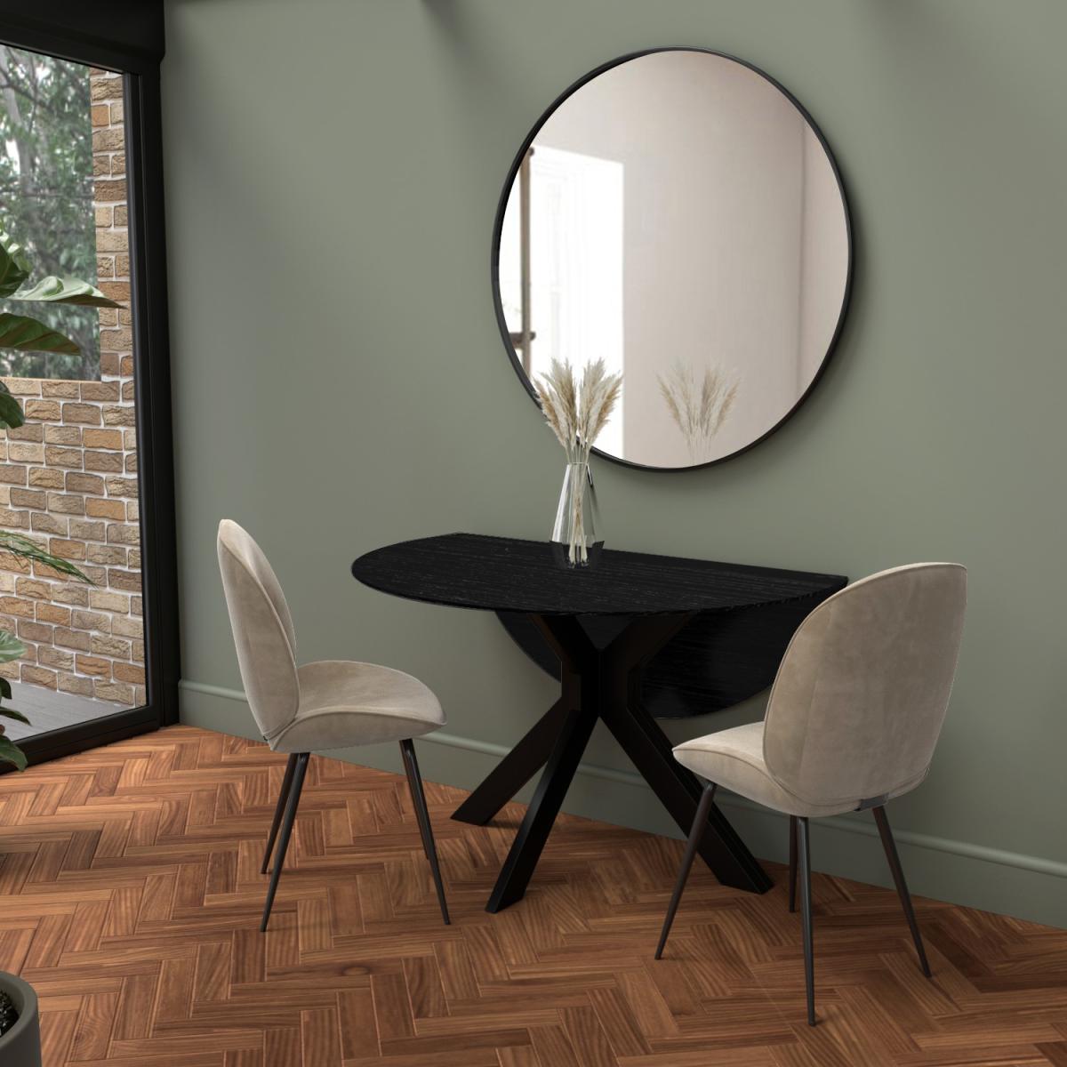 I love this round drop leaf table because of its versatility and sleek design. It's an excellent choice for smaller dining spaces or open-plan interiors, as the drop leaf feature allows you to expand it when hosting guests and tuck it away to save space afterwards. The black finish gives it a modern, sophisticated look that can complement a range of styles, from contemporary to minimal mid-century. For styling tips, consider pairing it with minimalist chairs in neutral tones for a clean aesthetic, or add textured runners and colourful placemats for a more inviting dining area. It works particularly well in urban apartments or kitchens that need a functional yet stylish centrepiece.