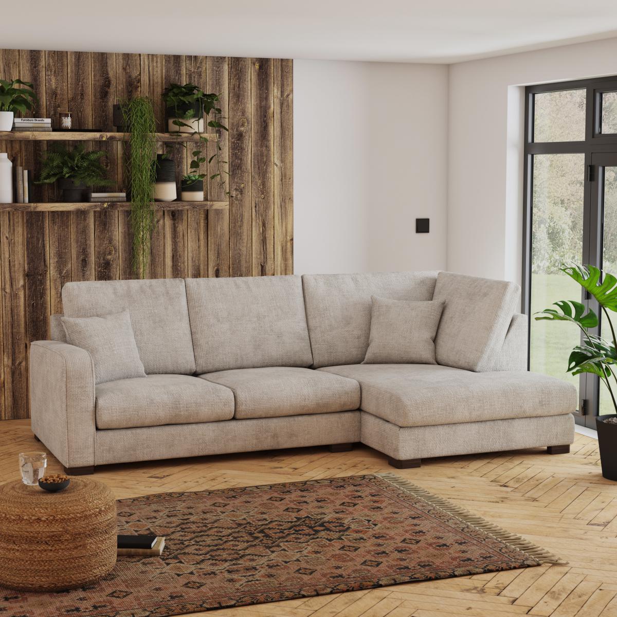 Made with comfort in mind, the Carson Right Hand Corner Chaise would make a welcome addition to any home. Boasting sprung, foam-filled extra deep seats, and fibre-wrapped foam back cushions, this sofa is the perfect place to sink back into after a long day. The Carson features soft and hard-wearing chunky chenille upholstery available in a choice of trendy colours and styled with a piped edge detailing and complementing black wooden feet for a smart, sophisticated look. This sofa also features removable cushion covers for easy care, and is supplied with two matching scatter cushions. Did you know, we now offer a 10 year frame guarantee on this sofa. To find out more, please. To check out our handy sizing guide to help you find out if you’ll be able to get your new furniture into your home.