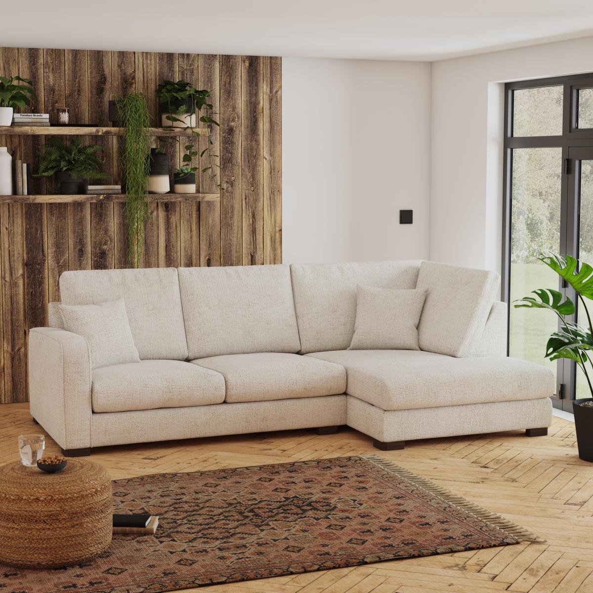 Made with comfort in mind, the Carson Right Hand Corner Chaise would make a welcome addition to any home. Boasting sprung, foam-filled extra deep seats, and fibre-wrapped foam back cushions, this sofa is the perfect place to sink back into after a long day. The Carson features soft and hard-wearing chunky chenille upholstery available in a choice of trendy colours and styled with a piped edge detailing and complementing black wooden feet for a smart, sophisticated look. This sofa also features removable cushion covers for easy care, and is supplied with two matching scatter cushions. Did you know, we now offer a 10 year frame guarantee on this sofa. To find out more, please. To check out our handy sizing guide to help you find out if you’ll be able to get your new furniture into your home.