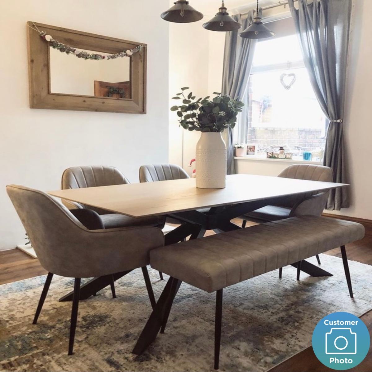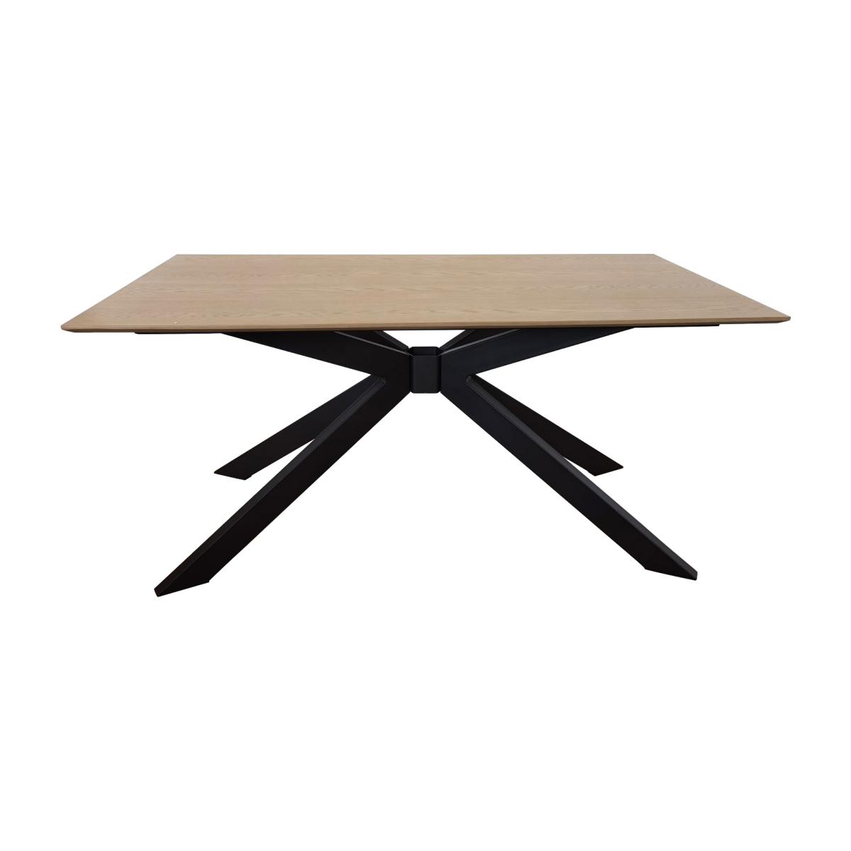 Features we love Industrial rectangular dining table. Featuring a beautifully crafted metal starburst frame. Its large oak tabletop ensures room for up to 6 people. Structural form is both elegant and visually striking. The contrasting elements create a luxurious feel. Other size tables available in the Carson range. Need to know. Dimensions. W160 x D90 x H75 cm Shape. Rectangle Colour. Natural Top Finish. Light Oak Veneer Base finish. Matte black powder-coated metal legs Material. Light oak veneer backed with MDF Base material. Metal Weight. 44kg Assembly required. Yes..