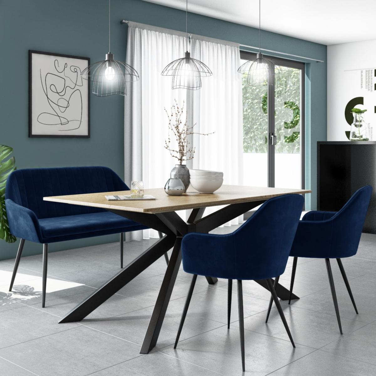 . This bundle includes. Light Oak Dining Table - Carson. 2 x Navy Blue Velvet Dining Chairs - Logan. Navy Blue Velvet High Back Dining Bench - Logan Dining Table Description Industrial rectangular dining table. Featuring a beautifully crafted metal starburst frame. Its large oak tabletop ensures room for up to 4 people. Structural form is both elegant and visually striking. The contrasting elements create a luxurious feel. Dining Table Information. Dimensions. W160 x D90 x H75 cm Shape. Rectangle Colour. Natural Top Finish. Light Oak Veneer Base finish. Matte black powder-coated metal legs Material. Light oak veneer backed with MDF Base material. Metal Weight. 44kg Assembly required. Yes Dining Bench Description Create a luxurious dining room with this velvet bench. Upholstered in high-quality soft-to-touch navy blue velvet High back and padded seat are stylish and comfortable Finished with vertical stitching for a classic feel. Two-tone design will bring a modern look to your space Sturdy frame construction offers long-lasting style. Dining Bench Information. Dimensions. H84 x W127 x D57 cm Maximum Weight Load. 150kg per seat (300kg) Weight. 14.5kg Colour. Navy blue Finish. Velvet upholestry Material. Velvet and metal Assembly required. Yes Dining Chair Description Includes 2 x navy blue velvet dining chairs with arms. Two tone navy blue and; black are the perfect constrast. They'll bring a modern touch to your space Sturdy frame construction All about me. Complete your dining room with a pair of Logan dining chairs. With an on trend design the styling is effortless. They feature curved chair backs with stunning black metal chair legs. Finished in navy blue velvet and black the two tone design brings a fresh look to your space with a modern touch. Crafted from navy blue velvet and; black metal they are highly durable and hardwearing easily withstanding the test of time in a busy family dining room. These chairs are supplied in pairs the chairs will require self-assembly. Dining Chair Information. Number of chairs. 2 Dimensions. H85 x W59 x D45 cm Maximum Load Weight. 150kg per chair Material. Velvet and; Metal Finish. Two tone - Navy Blue and; Black Assembly required. Yes.