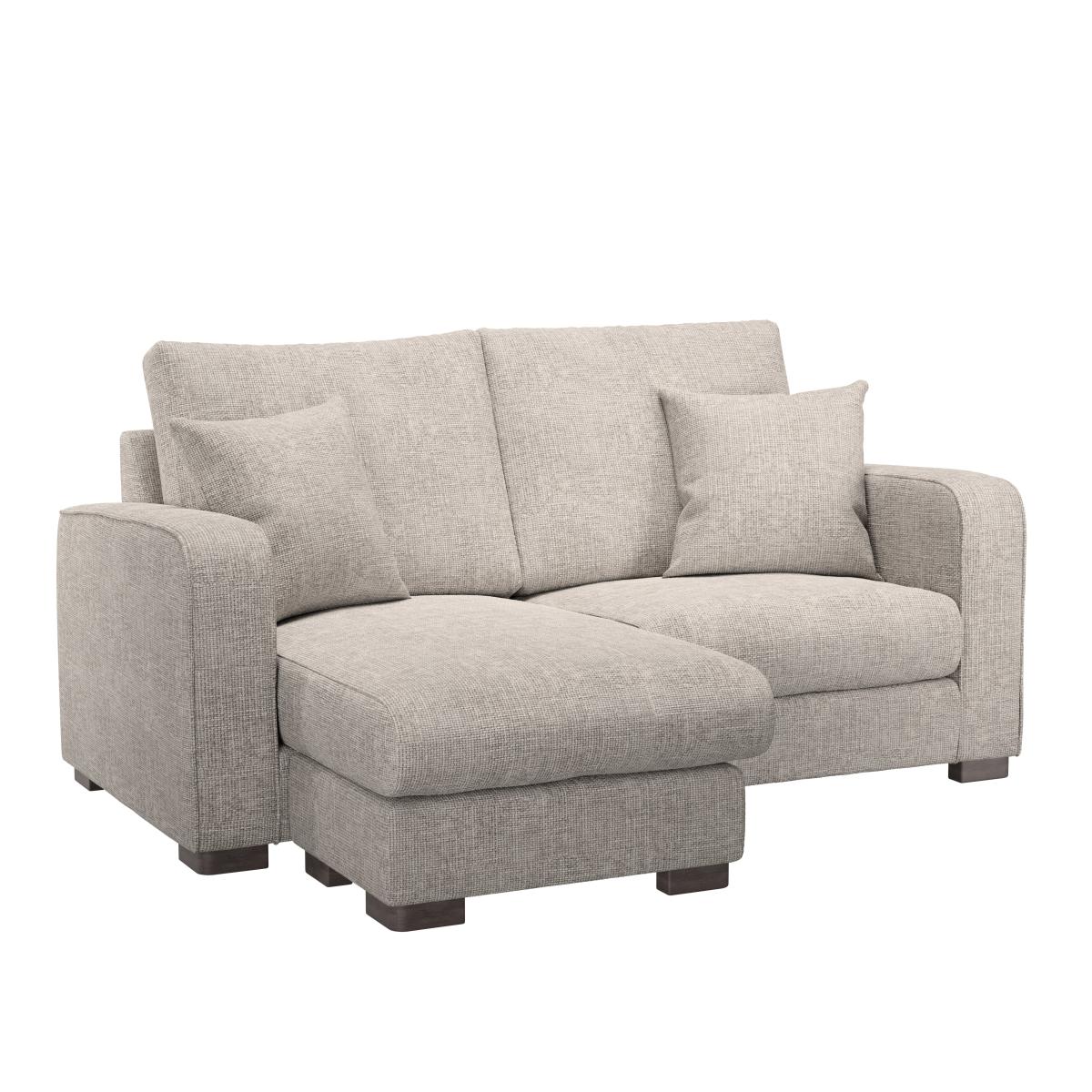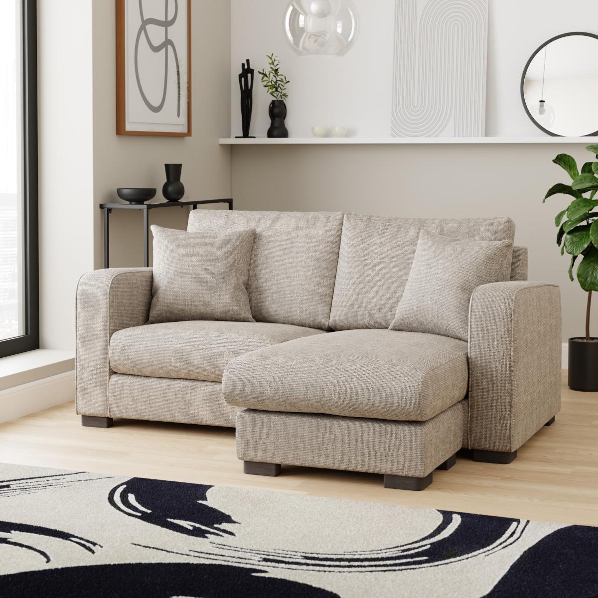 Designed with comfort in mind, the Carson Small Corner Chaise would make a welcome addition to any home and is especially ideal for smaller living room spaces. It comes with an adjustable footstool so that you can easily move it to the left seat or right seat to create a chaise. Boasting sprung, foam-filled extra deep seats, and fibre-wrapped foam back cushions, this sofa is the perfect place to sink back into after a long day. This stylish sofa features soft and hard-wearing chunky chenille upholstery and styled with a piped edge detailing and complementing dark wooden feet for a sophisticated look. This sofa also features removable cushion covers for easy care, and is supplied with two matching scatter cushions.