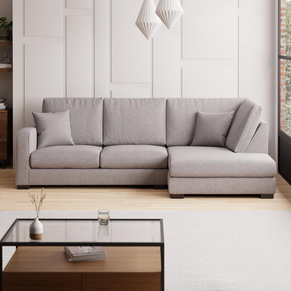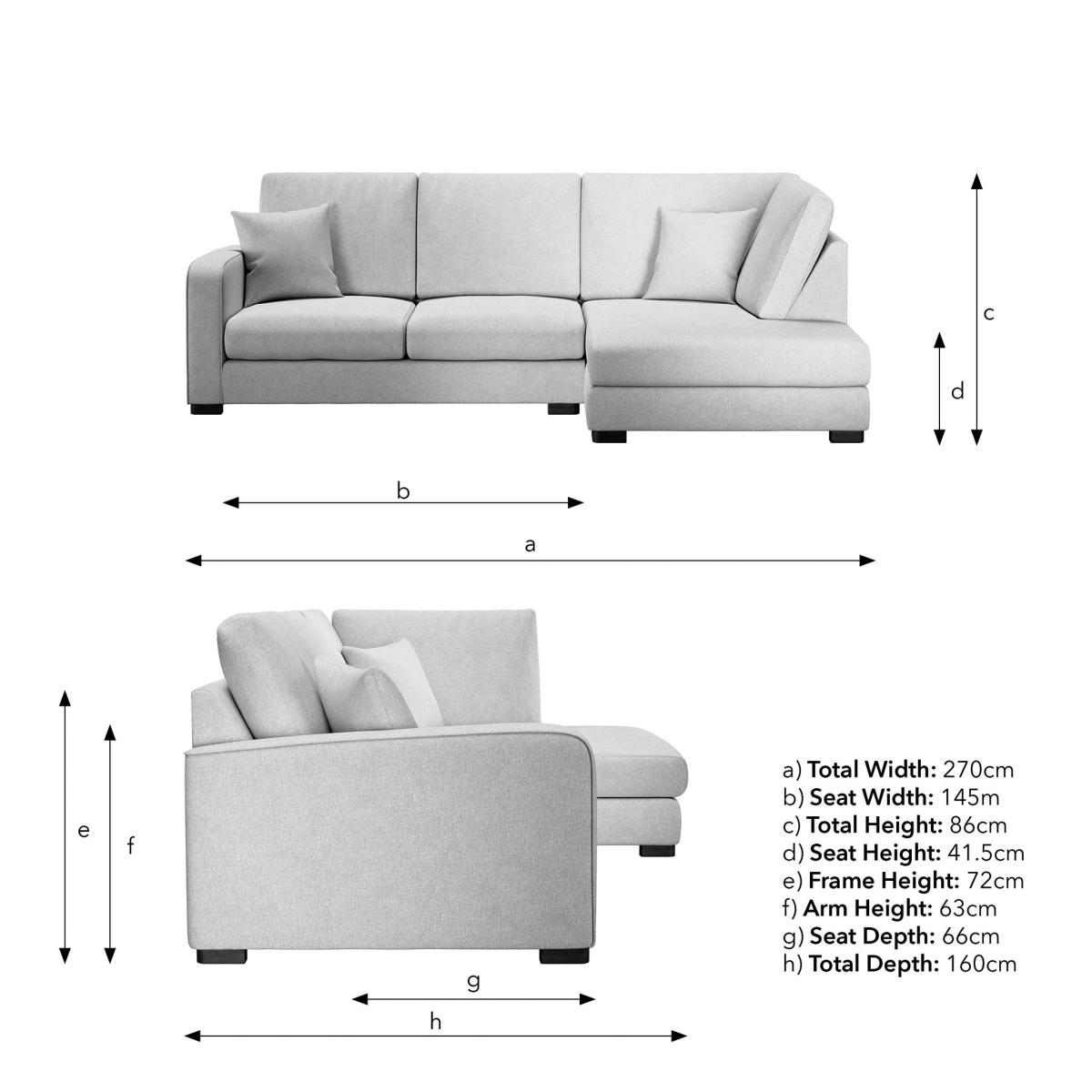 Made with comfort in mind, the Carson Right Hand Corner Chaise would make a welcome addition to any home. Boasting sprung, foam-filled extra deep seats, and fibre-wrapped foam back cushions, this sofa is the perfect place to sink back into after a long day. The Carson features a hard-wearing soft texture upholstery available in a choice of trendy colours and styled with a piped edge detailing and complementing black wooden feet for a smart, sophisticated look. This sofa also features removable cushion covers for easy care, and is supplied with two matching scatter cushions. Did you know, we now offer a 10 year frame guarantee on this sofa. To find out more, please. To check out our handy sizing guide to help you find out if you’ll be able to get your new furniture into your home. Need to throw out your old sofa first? View our information on. Furniture recycling and collections.