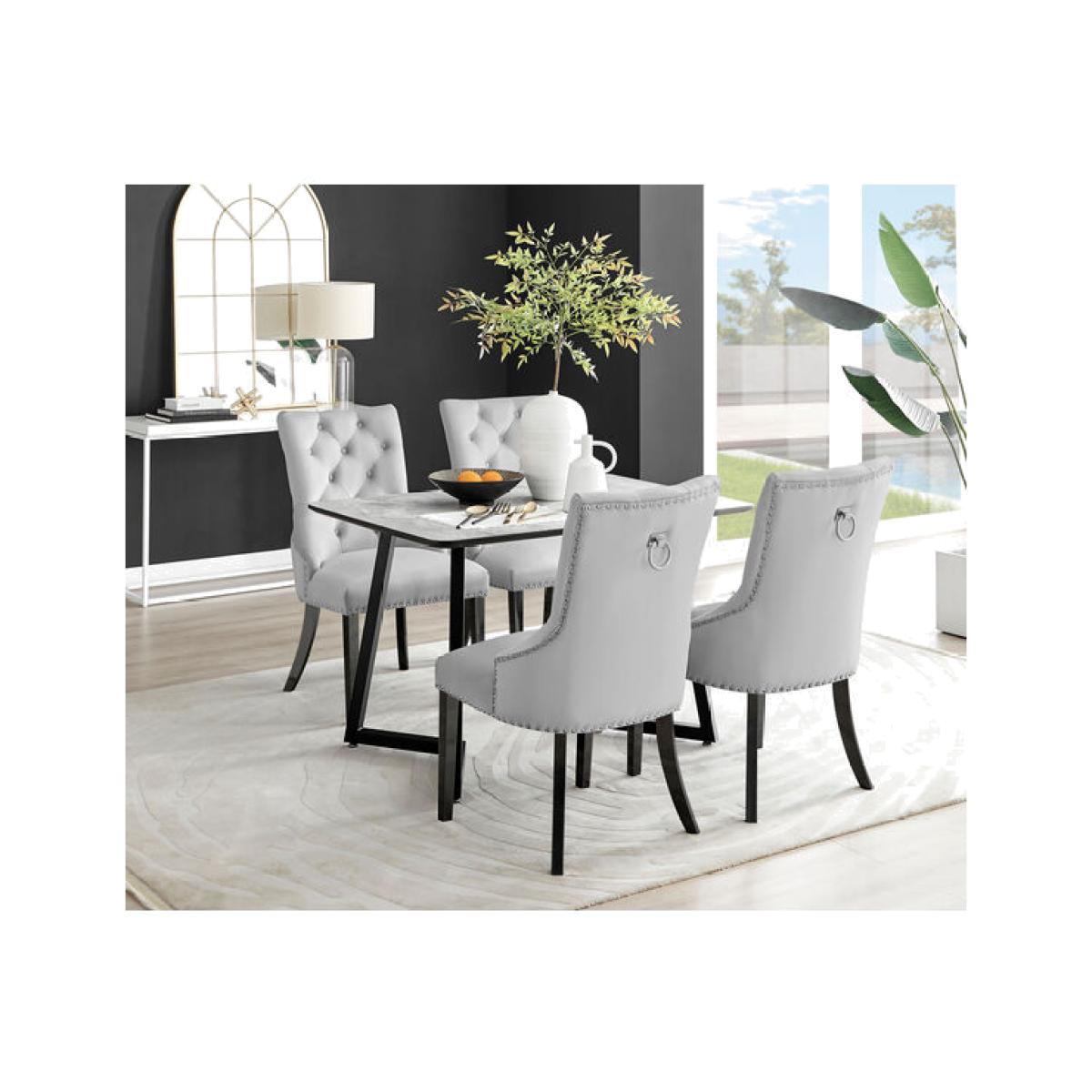 The Carson rectangular 4 seater marble-effect dining table is a statement piece for the interiors connoisseur. It oozes luxury and opulence. Boasting a 80cm x 120cm rectangular melamine tabletop made from on-trend marble effect veneer which is also scratch resistant! It's a gorgeous 6 seater dining table perfect for family dinners. Sitting on striking statement U shaped legs that feature an angular indent, in black powder-coated metal. A sleek, stylish dining table with minimalist industrial vibes. This beautifully designed dining table will set the scene for a stylish and luxurious room. Want to complete the look Shop our stylish dining chair range for ultimate ergonomic comfort.