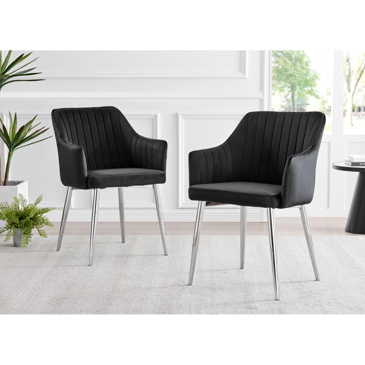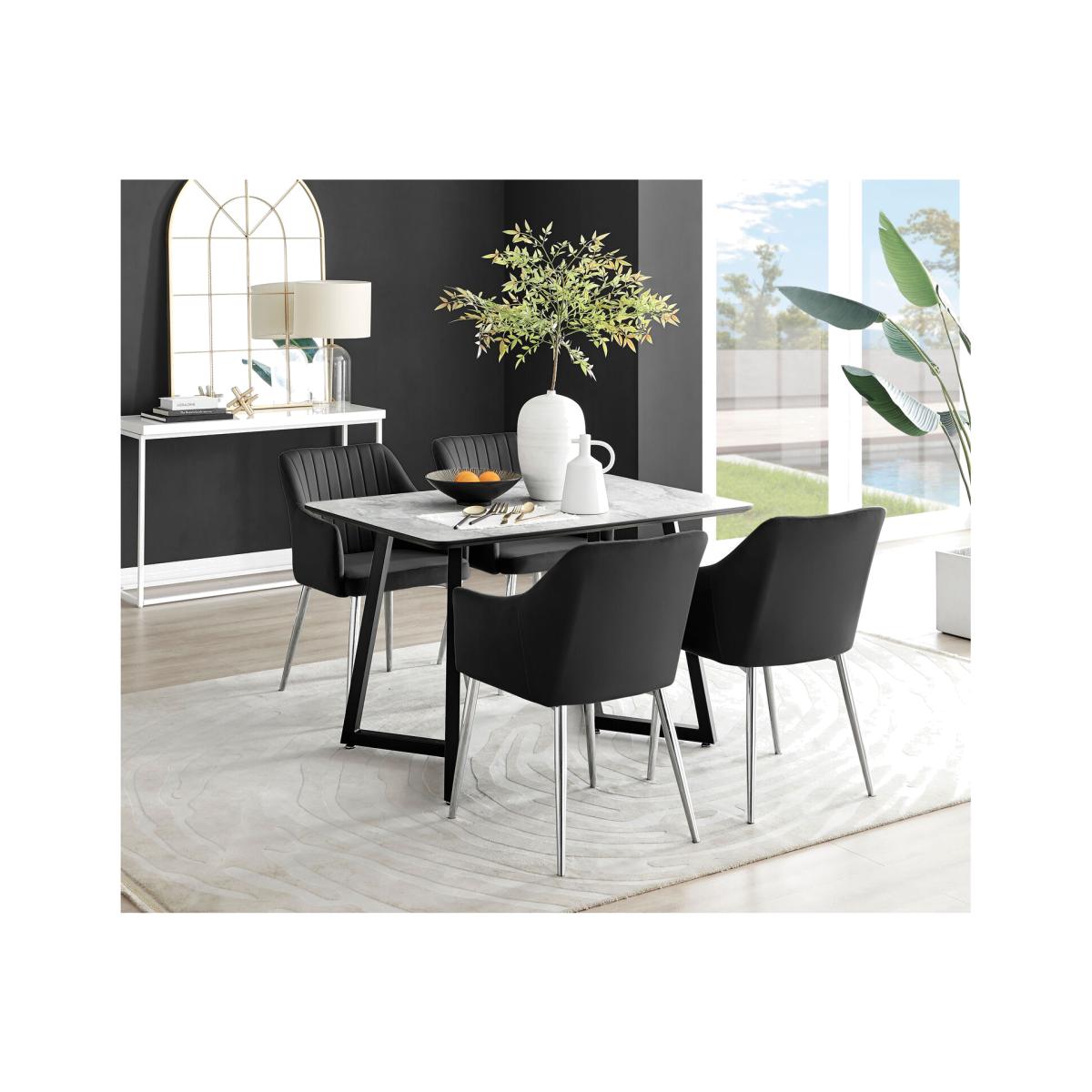 The Carson rectangular 4 seater marble-effect dining table is a statement piece for the interiors connoisseur. It oozes luxury and opulence. Boasting a 80cm x 120cm rectangular melamine tabletop made from on-trend marble effect veneer which is also scratch resistant! It's a gorgeous 6 seater dining table perfect for family dinners. Sitting on striking statement U shaped legs that feature an angular indent, in black powder-coated metal. A sleek, stylish dining table with minimalist industrial vibes. This beautifully designed dining table will set the scene for a stylish and luxurious room. Want to complete the look Shop our stylish dining chair range for ultimate ergonomic comfort.
