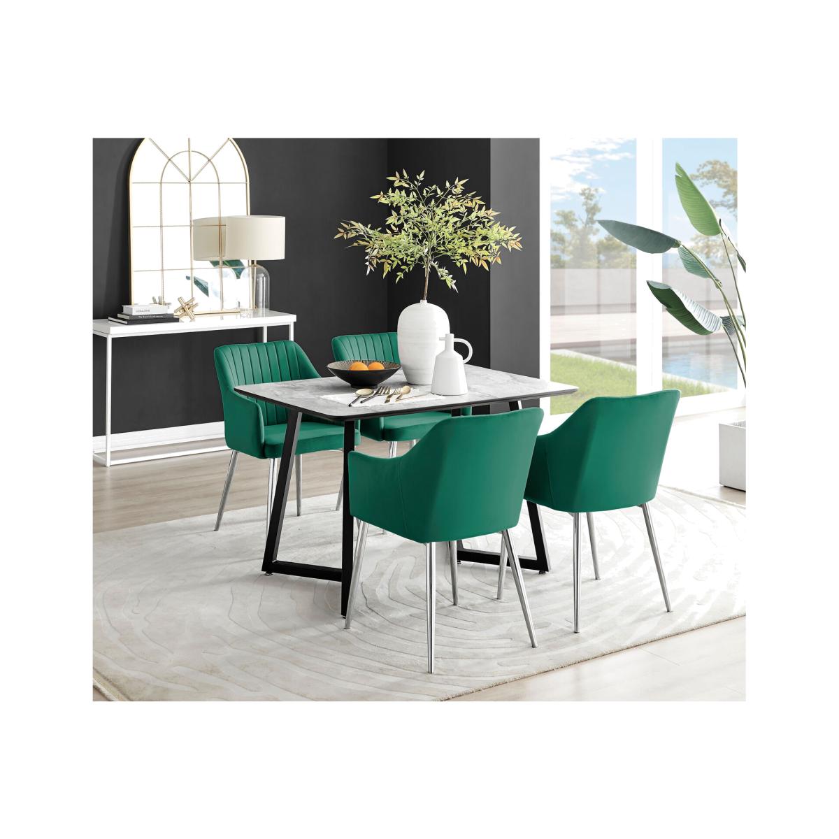 The Carson rectangular 4 seater marble-effect dining table is a statement piece for the interiors connoisseur. It oozes luxury and opulence. Boasting a 80cm x 120cm rectangular melamine tabletop made from on-trend marble effect veneer which is also scratch resistant! It's a gorgeous 6 seater dining table perfect for family dinners. Sitting on striking statement U shaped legs that feature an angular indent, in black powder-coated metal. A sleek, stylish dining table with minimalist industrial vibes. This beautifully designed dining table will set the scene for a stylish and luxurious room. Want to complete the look Shop our stylish dining chair range for ultimate ergonomic comfort.