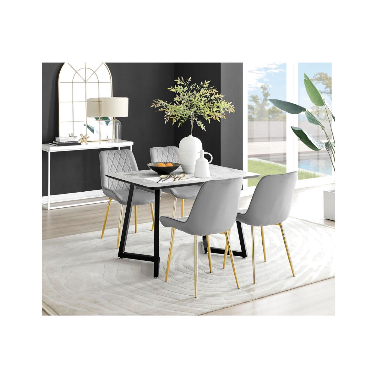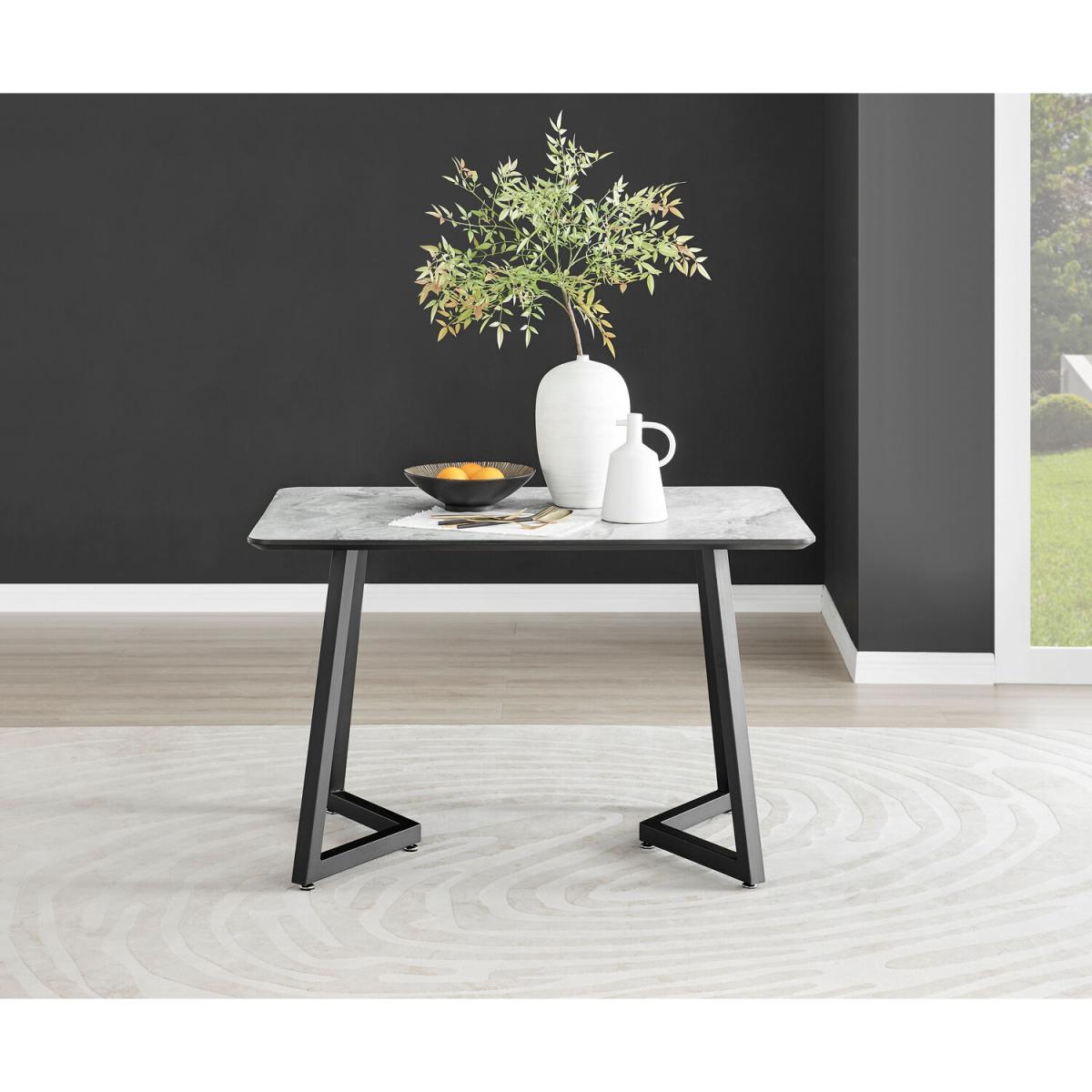 The Carson rectangular 4 seater marble-effect dining table is a statement piece for the interiors connoisseur. It oozes luxury and opulence. Boasting a 80cm x 120cm rectangular melamine tabletop made from on-trend marble effect veneer which is also scratch resistant! It's a gorgeous 6 seater dining table perfect for family dinners. Sitting on striking statement U shaped legs that feature an angular indent, in black powder-coated metal. A sleek, stylish dining table with minimalist industrial vibes. This beautifully designed dining table will set the scene for a stylish and luxurious room. Want to complete the look Shop our stylish dining chair range for ultimate ergonomic comfort.