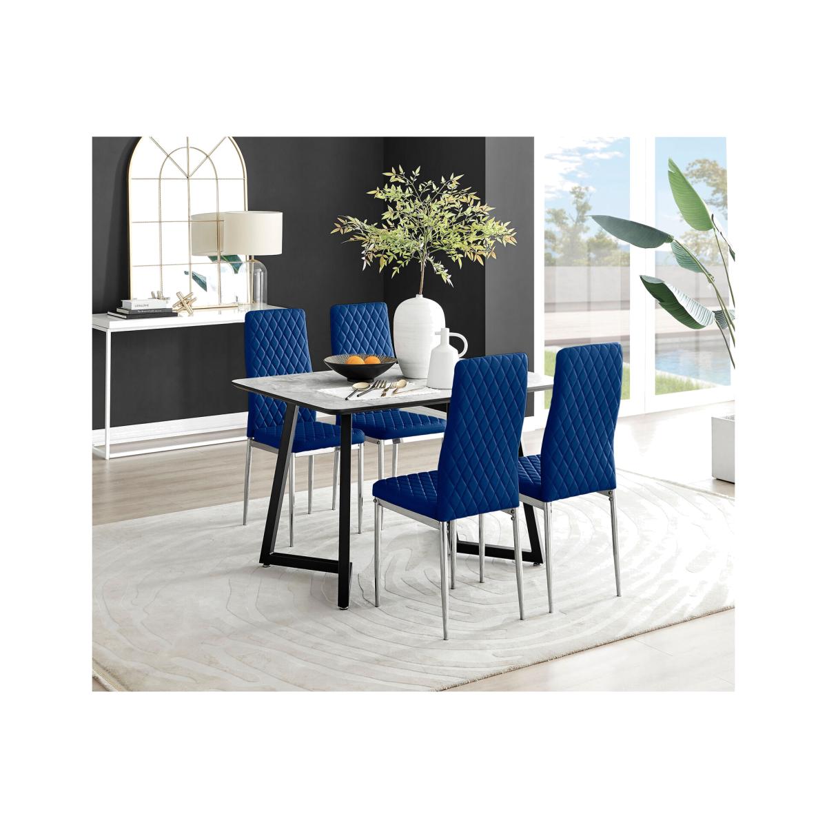 The Carson rectangular 4 seater marble-effect dining table is a statement piece for the interiors connoisseur. It oozes luxury and opulence. Boasting a 80cm x 120cm rectangular melamine tabletop made from on-trend marble effect veneer which is also scratch resistant! It's a gorgeous 4 seater dining table perfect for family dinners. We think you'll find it most comfortable with guests sitting 1 one each side, rather than 2 guests sat next to each other. Sitting on striking statement U shaped legs that feature an angular indent, in black powder-coated metal. A sleek, stylish dining table with minimalist industrial vibes. This beautifully designed dining table will set the scene for a stylish and luxurious room. Want to complete the look Shop our stylish dining chair range for ultimate ergonomic comfort. Upholstered in soft touch navy blue velvet and finished with diamond pattern stitching the Milan dining chairs would seamlessly fit in with most dining spaces, whilst not compromising on either style or comfort. The stylish shiny chrome silver leg and hatched velvet combination gives this chair a contemporary edge, whilst it's simple design allows for practical everyday usage. The chairs are made from high quality durable velvet that's easy to keep clean and are ergonomically designed for maximum comfort and support. They feature a deep foam seat cushion and plastic feet to protect the floor from any damage! At an unbeatable price you cannot go wrong with these chairs!
