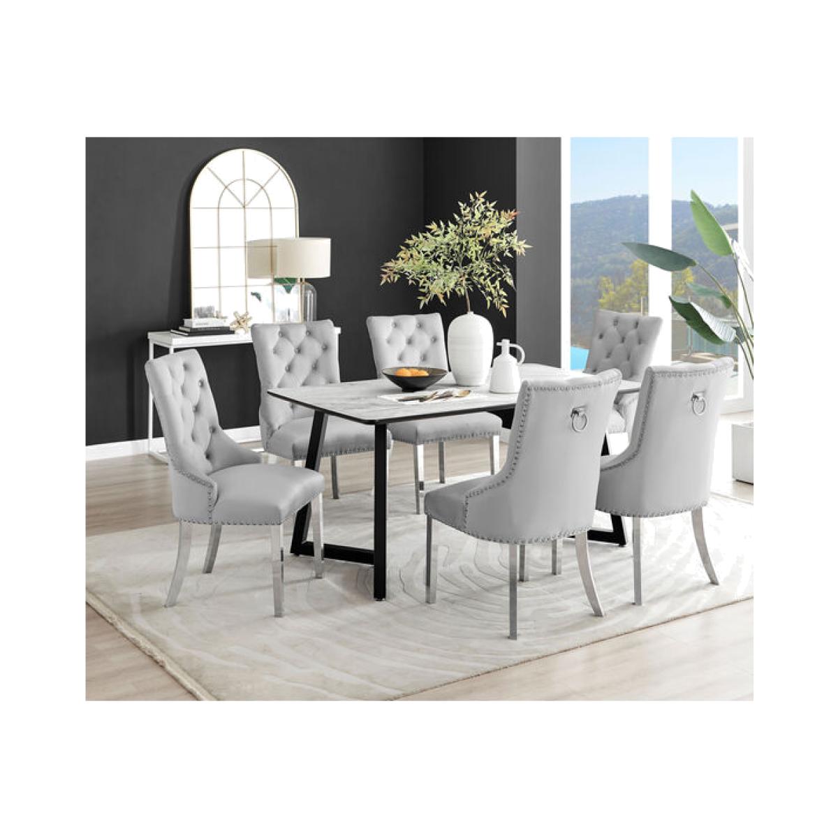 The Carson rectangular 6 seater marble-effect dining table is a statement piece for the interiors connoisseur. It oozes luxury and opulence. Boasting a 90cm x 160cm rectangular melamine tabletop made from on-trend marble effect veneer which is also scratch resistant! It's a gorgeous 6 seater dining table perfect for family dinners and entertaining guests. Sitting on striking statement U shaped legs that feature an angular indent, in black powder-coated metal. A sleek, stylish dining table with minimalist industrial vibes. This beautifully designed dining table will set the scene for a stylish and luxurious room. Want to complete the look Shop our stylish dining chair range for ultimate ergonomic comfort.
