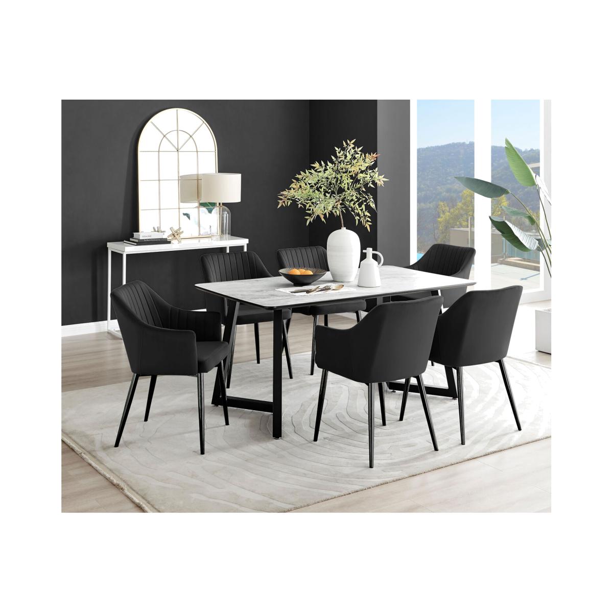 The Carson rectangular 6 seater marble-effect dining table is a statement piece for the interiors connoisseur. It oozes luxury and opulence. Boasting a 90cm x 160cm rectangular melamine tabletop made from on-trend marble effect veneer which is also scratch resistant! It's a gorgeous 6 seater dining table perfect for family dinners and entertaining guests. Sitting on striking statement U shaped legs that feature an angular indent, in black powder-coated metal. A sleek, stylish dining table with minimalist industrial vibes. This beautifully designed dining table will set the scene for a stylish and luxurious room. Want to complete the look Shop our stylish dining chair range for ultimate ergonomic comfort.