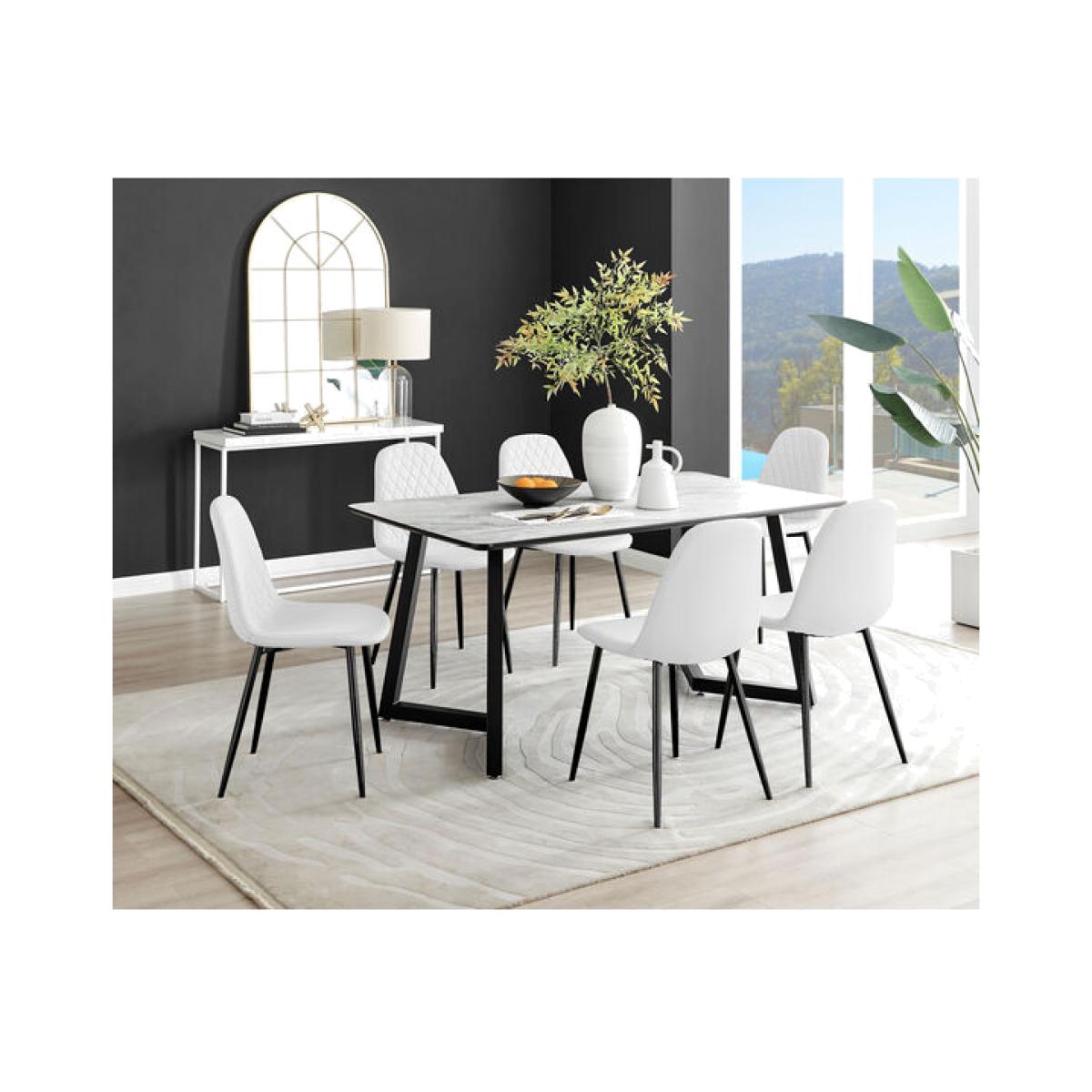 The Carson rectangular 6 seater marble-effect dining table is a statement piece for the interiors connoisseur. It oozes luxury and opulence. Boasting a 90cm x 160cm rectangular melamine tabletop made from on-trend marble effect veneer which is also scratch resistant! It's a gorgeous 6 seater dining table perfect for family dinners and entertaining guests. Sitting on striking statement U shaped legs that feature an angular indent, in black powder-coated metal. A sleek, stylish dining table with minimalist industrial vibes. This beautifully designed dining table will set the scene for a stylish and luxurious room. Want to complete the look Shop our stylish dining chair range for ultimate ergonomic comfort.