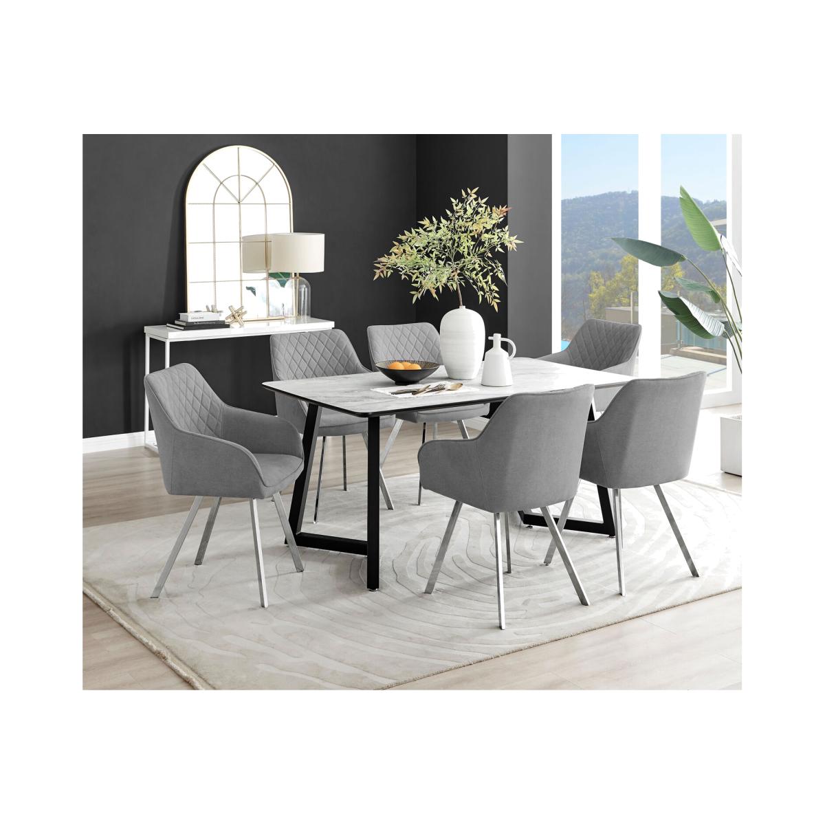 The Carson rectangular 6 seater marble-effect dining table is a statement piece for the interiors connoisseur. It oozes luxury and opulence. Boasting a 90cm x 160cm rectangular melamine tabletop made from on-trend marble effect veneer which is also scratch resistant! It's a gorgeous 6 seater dining table perfect for family dinners and entertaining guests. Sitting on striking statement U shaped legs that feature an angular indent, in black powder-coated metal. A sleek, stylish dining table with minimalist industrial vibes. This beautifully designed dining table will set the scene for a stylish and luxurious room. Want to complete the look Shop our stylish dining chair range for ultimate ergonomic comfort.
