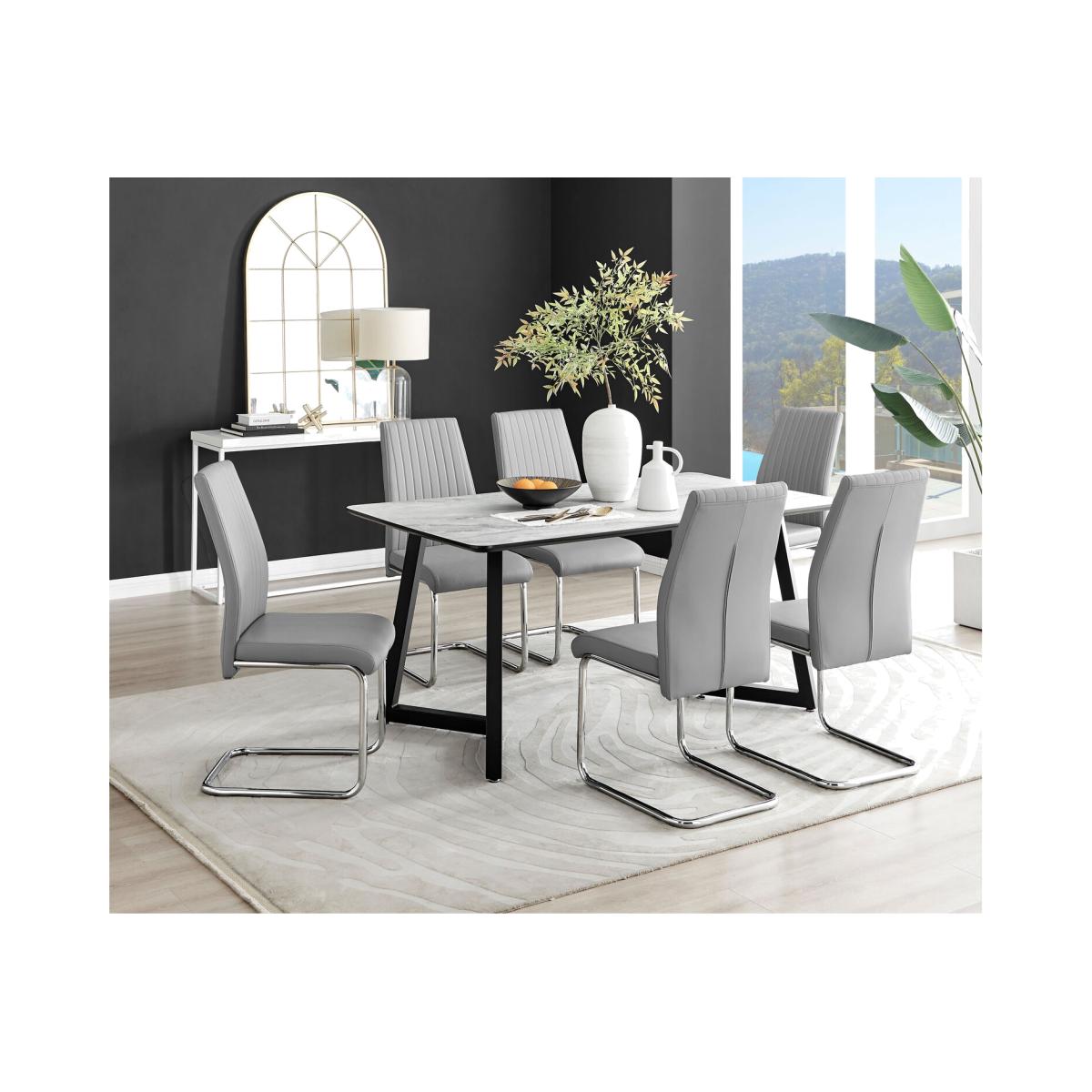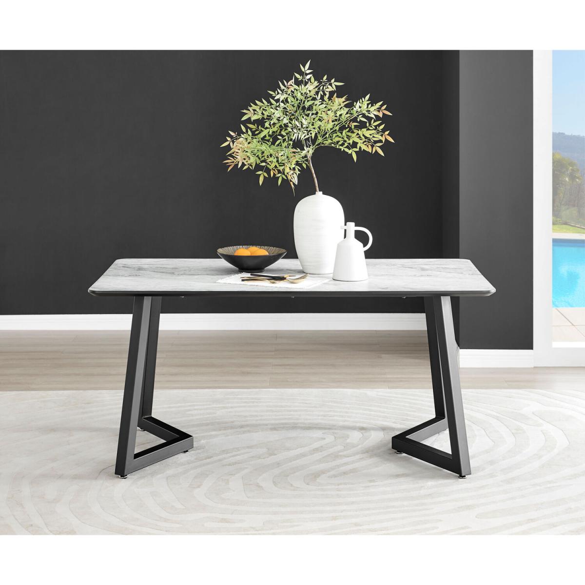 The Carson rectangular 6 seater marble-effect dining table is a statement piece for the interiors connoisseur. It oozes luxury and opulence. Boasting a 90cm x 160cm rectangular melamine tabletop made from on-trend marble effect veneer which is also scratch resistant! It's a gorgeous 6 seater dining table perfect for family dinners and entertaining guests. Sitting on striking statement U shaped legs that feature an angular indent, in black powder-coated metal. A sleek, stylish dining table with minimalist industrial vibes. This beautifully designed dining table will set the scene for a stylish and luxurious room. Want to complete the look Shop our stylish dining chair range for ultimate ergonomic comfort.