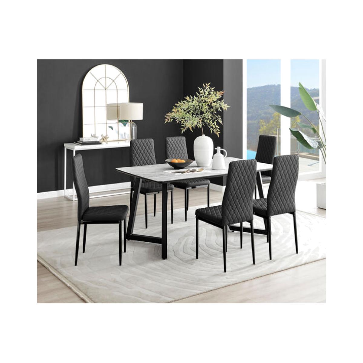 The Carson rectangular 6 seater marble-effect dining table is a statement piece for the interiors connoisseur. It oozes luxury and opulence. Boasting a 90cm x 160cm rectangular melamine tabletop made from on-trend marble effect veneer which is also scratch resistant! It's a gorgeous 6 seater dining table perfect for family dinners and entertaining guests. Sitting on striking statement U shaped legs that feature an angular indent, in black powder-coated metal. A sleek, stylish dining table with minimalist industrial vibes. This beautifully designed dining table will set the scene for a stylish and luxurious room. Want to complete the look Shop our stylish dining chair range for ultimate ergonomic comfort.