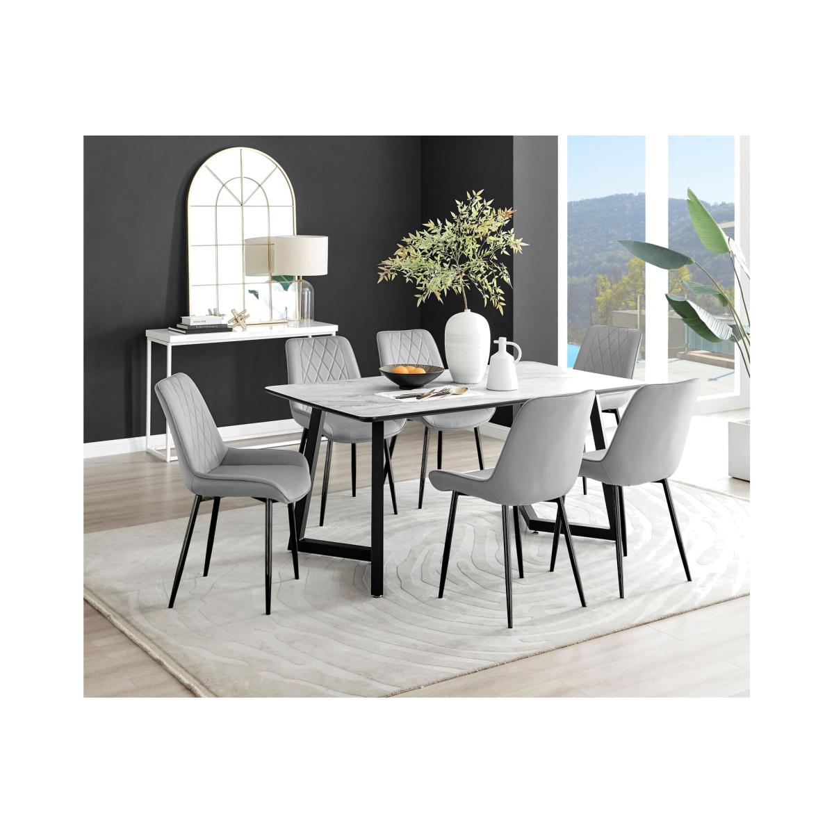 The Carson rectangular 6 seater marble-effect dining table is a statement piece for the interiors connoisseur. It oozes luxury and opulence. Boasting a 90cm x 160cm rectangular melamine tabletop made from on-trend marble effect veneer which is also scratch resistant! It's a gorgeous 6 seater dining table perfect for family dinners and entertaining guests. Sitting on striking statement U shaped legs that feature an angular indent, in black powder-coated metal. A sleek, stylish dining table with minimalist industrial vibes. This beautifully designed dining table will set the scene for a stylish and luxurious room. Want to complete the look Shop our stylish dining chair range for ultimate ergonomic comfort.