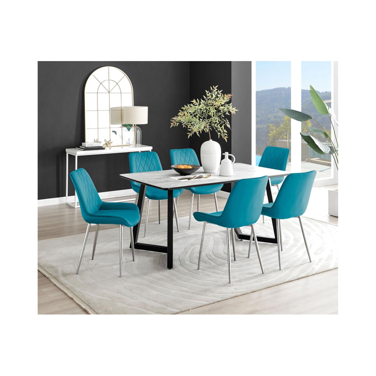 The Carson rectangular 6 seater marble-effect dining table is a statement piece for the interiors connoisseur. It oozes luxury and opulence. Boasting a 90cm x 160cm rectangular melamine tabletop made from on-trend marble effect veneer which is also scratch resistant! It's a gorgeous 6 seater dining table perfect for family dinners and entertaining guests. Sitting on striking statement U shaped legs that feature an angular indent, in black powder-coated metal. A sleek, stylish dining table with minimalist industrial vibes. This beautifully designed dining table will set the scene for a stylish and luxurious room.
