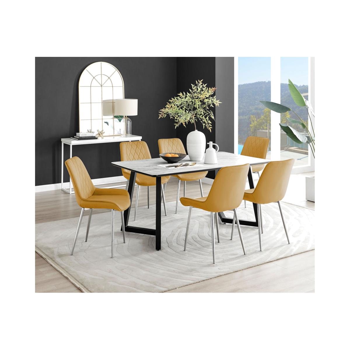 The Carson rectangular 6 seater marble-effect dining table is a statement piece for the interiors connoisseur. It oozes luxury and opulence. Boasting a 90cm x 160cm rectangular melamine tabletop made from on-trend marble effect veneer which is also scratch resistant! It's a gorgeous 6 seater dining table perfect for family dinners and entertaining guests. Sitting on striking statement U shaped legs that feature an angular indent, in black powder-coated metal. A sleek, stylish dining table with minimalist industrial vibes. This beautifully designed dining table will set the scene for a stylish and luxurious room. Want to complete the look Shop our stylish dining chair range for ultimate ergonomic comfort.