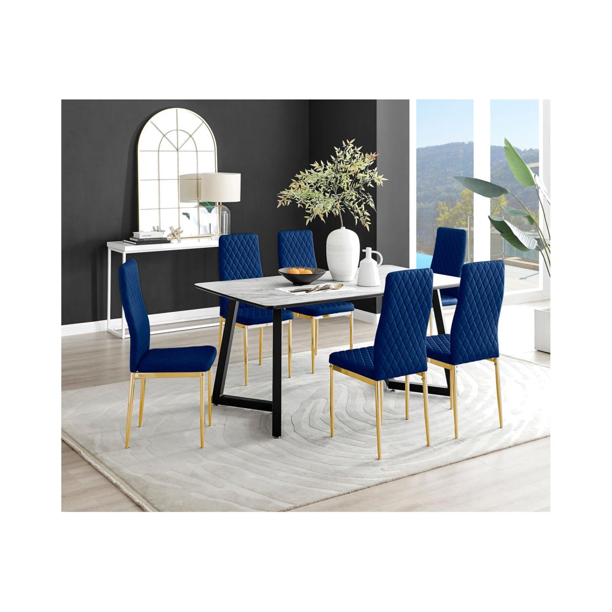 The Carson rectangular 6 seater marble-effect dining table is a statement piece for the interiors connoisseur. It oozes luxury and opulence. Boasting a 90cm x 160cm rectangular melamine tabletop made from on-trend marble effect veneer which is also scratch resistant! It's a gorgeous 6 seater dining table perfect for family dinners and entertaining guests. Sitting on striking statement U shaped legs that feature an angular indent, in black powder-coated metal. A sleek, stylish dining table with minimalist industrial vibes. This beautifully designed dining table will set the scene for a stylish and luxurious room. Want to complete the look Shop our stylish dining chair range for ultimate ergonomic comfort. Upholstered in soft touch navy blue velvet and finished with diamond pattern stitching the Milan dining chairs would seamlessly fit in with most dining spaces, whilst not compromising on either style or comfort. The stylish gold shiny chrome metal leg and hatched velvet combination gives this chair a contemporary edge, whilst it's simple design allows for practical everyday usage. The chairs are made from high quality durable velvet that's easy to keep clean and are ergonomically designed for maximum comfort and support. They feature a deep foam seat cushion and plastic feet to protect the floor from any damage! At an unbeatable price you cannot go wrong with these chairs!