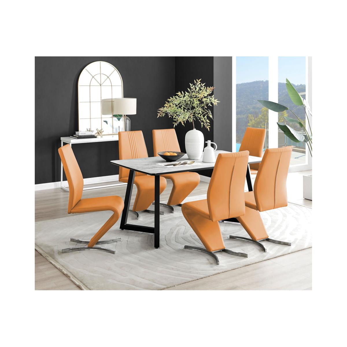 The Carson rectangular 6 seater marble-effect dining table is a statement piece for the interiors connoisseur. It oozes luxury and opulence. Boasting a 90cm x 160cm rectangular melamine tabletop made from on-trend marble effect veneer which is also scratch resistant! It's a gorgeous 6 seater dining table perfect for family dinners and entertaining guests. Sitting on striking statement U shaped legs that feature an angular indent, in black powder-coated metal. A sleek, stylish dining table with minimalist industrial vibes. This beautifully designed dining table will set the scene for a stylish and luxurious room. Want to complete the look Shop our stylish dining chair range for ultimate ergonomic comfort.