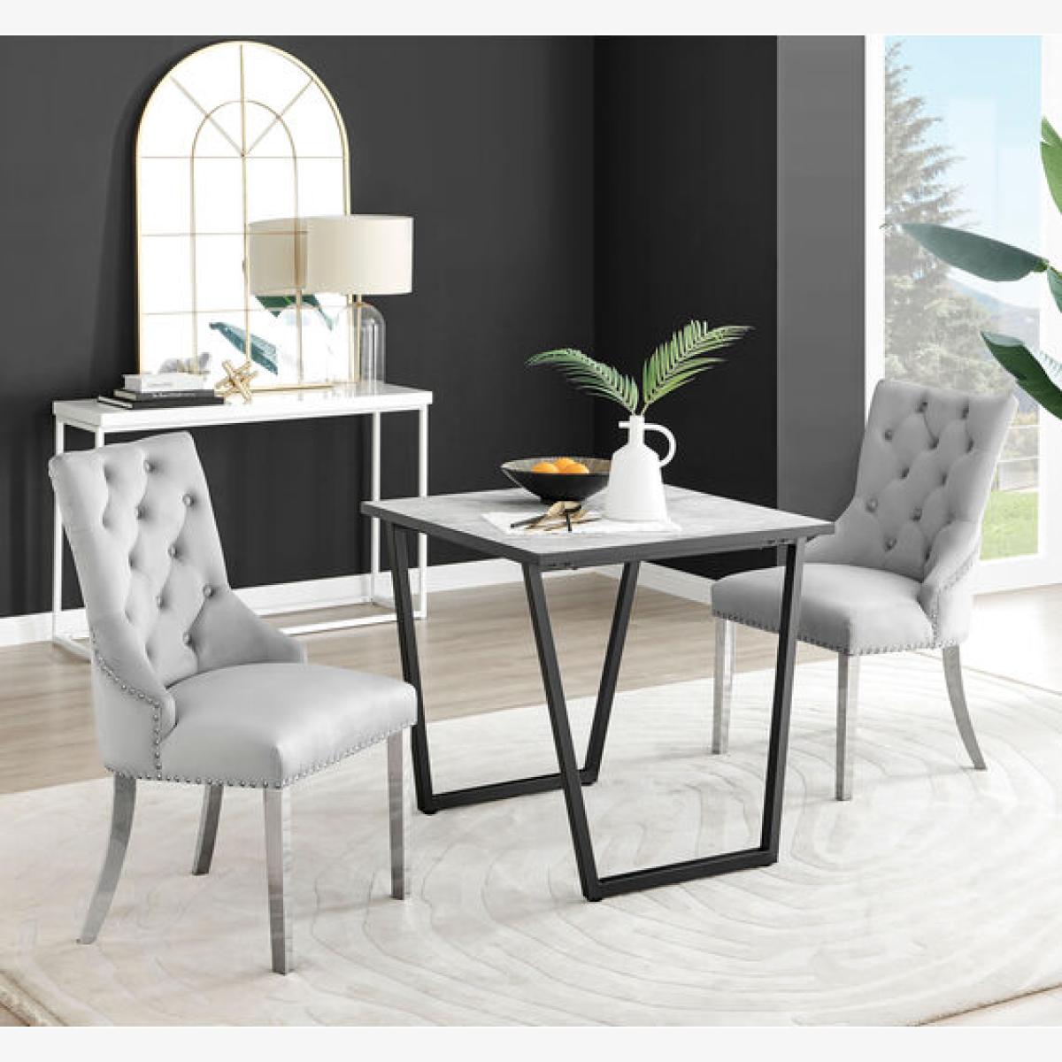 The Carson square 2 seater marble-effect dining table is a statement piece for the interiors connoisseur. It oozes luxury and opulence. Featuring an 80cm x 80cm square melamine tabletop made from on-trend marble effect veneer which is also scratch resistant! It's a compact 2 seater dining table perfect for smaller spaces. Sitting on striking statement U shaped legs in black powder-coated metal. A sleek, stylish dining table with minimalist industrial vibes. This beautifully designed dining table will set the scene for a stylish and luxurious room. Want to complete the look Shop our stylish dining chair range for ultimate ergonomic comfort.