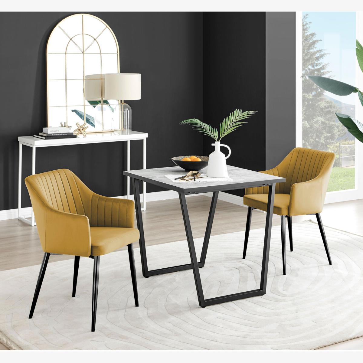 The Carson square 2 seater marble-effect dining table is a statement piece for the interiors connoisseur. It oozes luxury and opulence. Featuring an 80cm x 80cm square melamine tabletop made from on-trend marble effect veneer which is also scratch resistant! It's a compact 2 seater dining table perfect for smaller spaces. Sitting on striking statement U shaped legs in black powder-coated metal. A sleek, stylish dining table with minimalist industrial vibes. This beautifully designed dining table will set the scene for a stylish and luxurious room. Want to complete the look Shop our stylish dining chair range for ultimate ergonomic comfort.